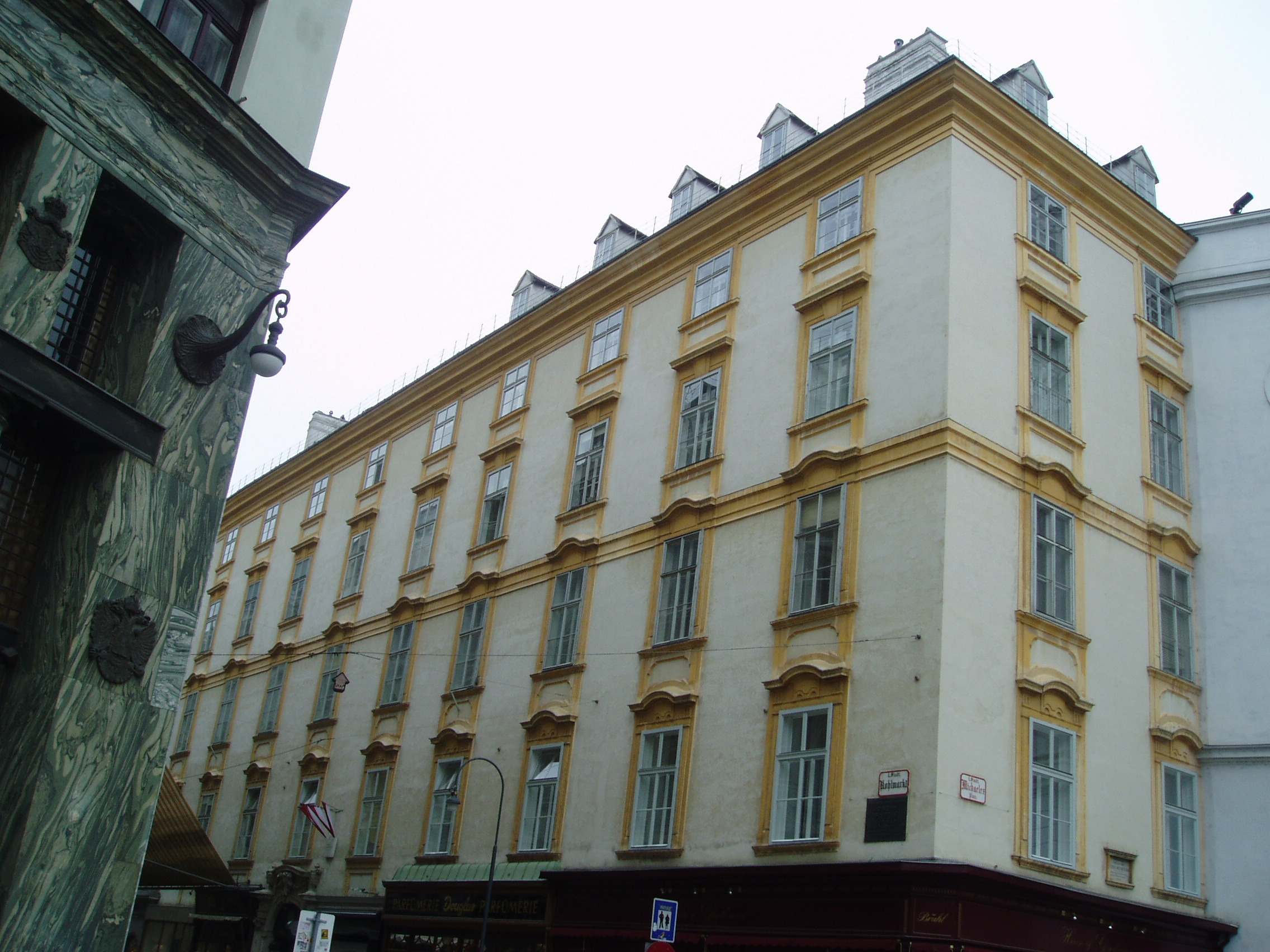 Nyilvános 1206 | 2092 | Kohlmarkt 11.Grosses Michaelerhaus | A "nagy" Szent Mihály-ház Bécs belvárosában, a Burghoz közel, a Szent Mihály templom (lásd: Michaelerplatz 1.) tőszomszédságában áll. Belső udvarán középkori összevisszaságban tapadnak egymáshoz és a szomszédos templom falához a kisebb-nagyobb toldaléképületek. Ebben a házban lakott 1750 és 1757 között a fiatal Joseph Haydn. Nyimorúságos padlásszobácskája volt itt, fűteni nem lehetett, s a rossz tetőszerkezeten át gyakran beesett hozzá az eső. Ekkoriban a szomszédos templom orgonistájaként működött. Vele egyidőben ugyanebben a házban lakott Pietro Metastasio, az udvari költő, és Nicola Porpora, a kitűnő muzsikus, énektanár. |