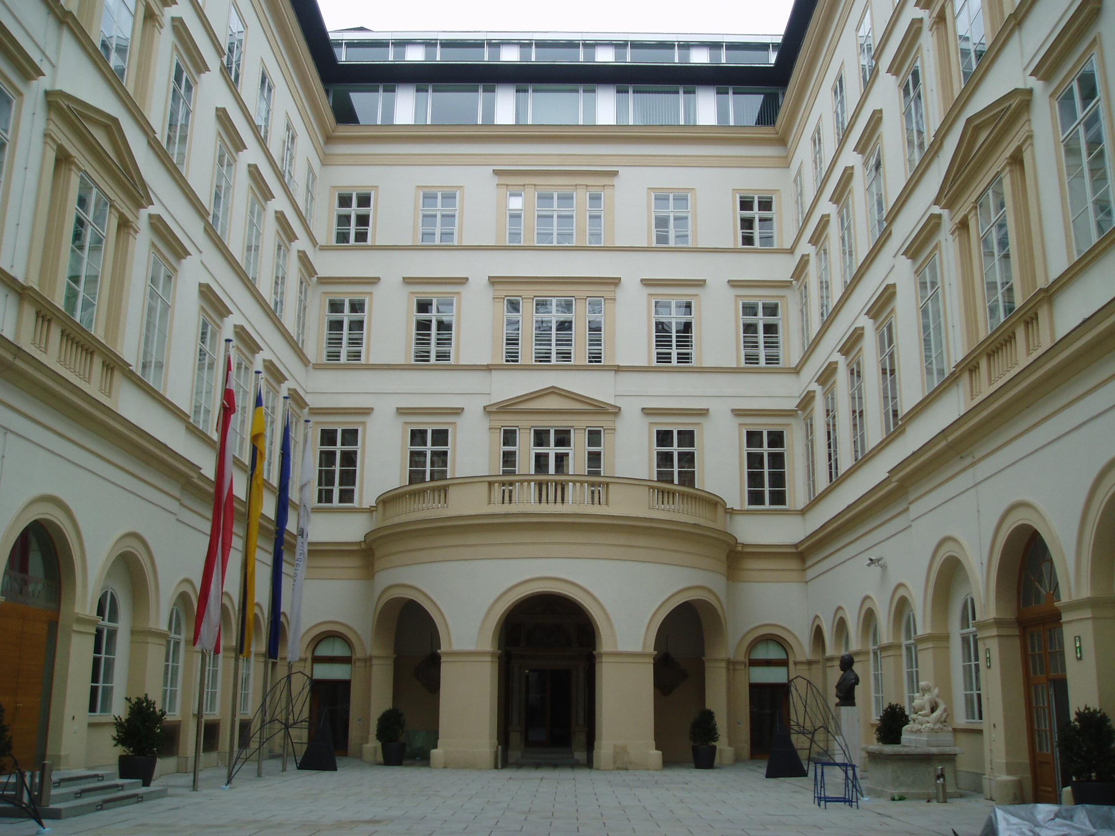 Nyilvános 1572 | 3357 | Herrengasse 13. Landhaus (a régi országház) belső udvara | A hatalmas palota építési ideje nem ismert, de az 1500-as években már állt. Azóta többször átépítették, jelenlegi klasszicista köntösét 1832-48 között kapta. Ebben a palotában ült össze évszázadokon keresztül, I. Miksa uralkodása óta az alsó-ausztriai rendi gyűlés. Ma az alsó-ausztriai kormány hivatala. Klasszicista Festsaal-ja (ünnepi terem) nevezetes hangversenyek színhelye volt. Falai között megfordult Schubert, Beethoven, s itt adta első bécsi koncertjét egy 12 éves magyar csodagyermek, Liszt Ferenc. |