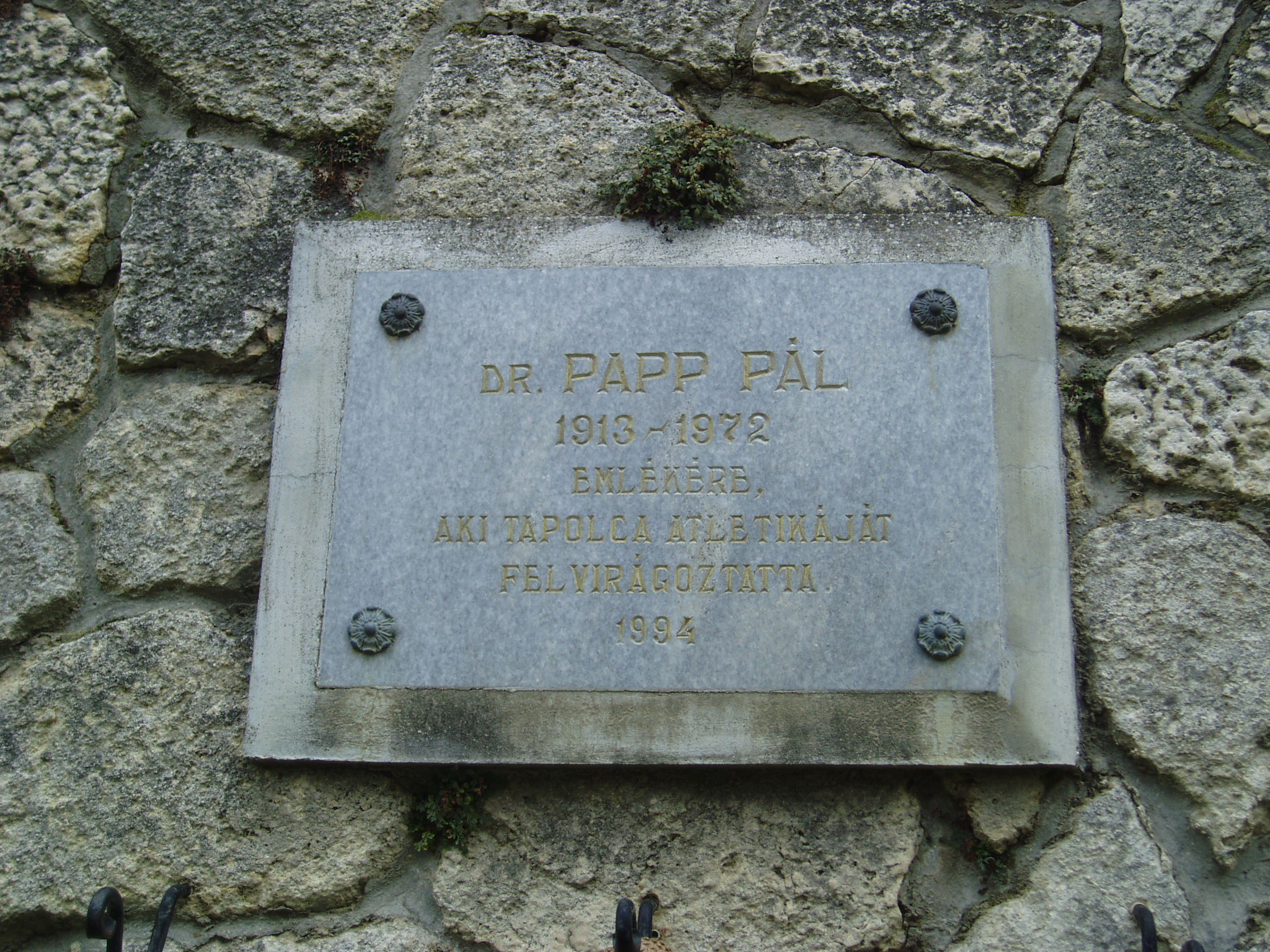 Nyilvános 1096 | 1747 | Tapolca, Városi Panteonfal: Papp Pál emléktáblája | A Malom–tó mögött álló magas kőfal a Városi Panteonfal, amelyen több neves, tapolcai kötődésű személyiségnek állítottak emléktáblát. Dr. Papp Pál (1913-1972) atlátaedző Tapolca sportéletének jeles alakja, felvirágoztatója volt. A felvétel 2007 februárjában készült. Felh. irod.: Bándi László: Emlékhelyek Veszprém megyében. Veszprém, 1996 www.tapolca.hu |