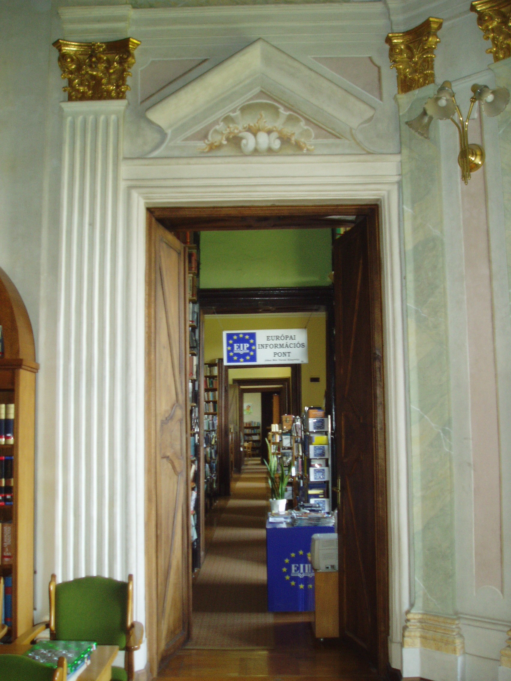 Nyilvános 1122 | 1965 | Pápa, Fő tér 1-3. Esterházy-kastély | A barokk kastély a korábban itt állott végvár helyére épült, részben annak alapfalai, kövei felhasználásával. A régi várat az 1740-es évektől Esterházy Ferenc (1683–1754) tárnokmester kezdte átalakítani Franz Anton Pilgram tervei alapján. A barokk várkastély kialakítása 1784-re fejeződött be Esterházy Ferenc fia, Eszterházy Károly egri püspök idejében Fellner Jakab, majd Grossmann József vezetésével. Az U alakú, egyemeletes épület a versailles-i palota nyomán elterjedt francia kastélytípus képviselője. Az épület keleti szárnyának emeletén volt a kastély kápolnája. Az 1988/89-ben végzett restaurálás eredményeképpen ma újra megcsodálható a helyiség eredeti architektúrája és Joseph Ignaz Mildorfer 1750 körül festett mennyezetképe, amely Krisztus mennybemenetelét ábrázolja. A kápolnában, amelynek példaszerű felújításáért a város 1990-ben Europa Nostra díjat kapott, ma a Jókai Mór Városi Könyvtár olvasóterme működik. A fénykép 2007 áprilisában készült. Felh. irod.: Németh Adél - Szabó Lajos: Pápa. Bp. Panoráma, 1989 Pápa. Szerk. Sz. Farkas Aranka. Bp., Magyar Képek, 2000 |