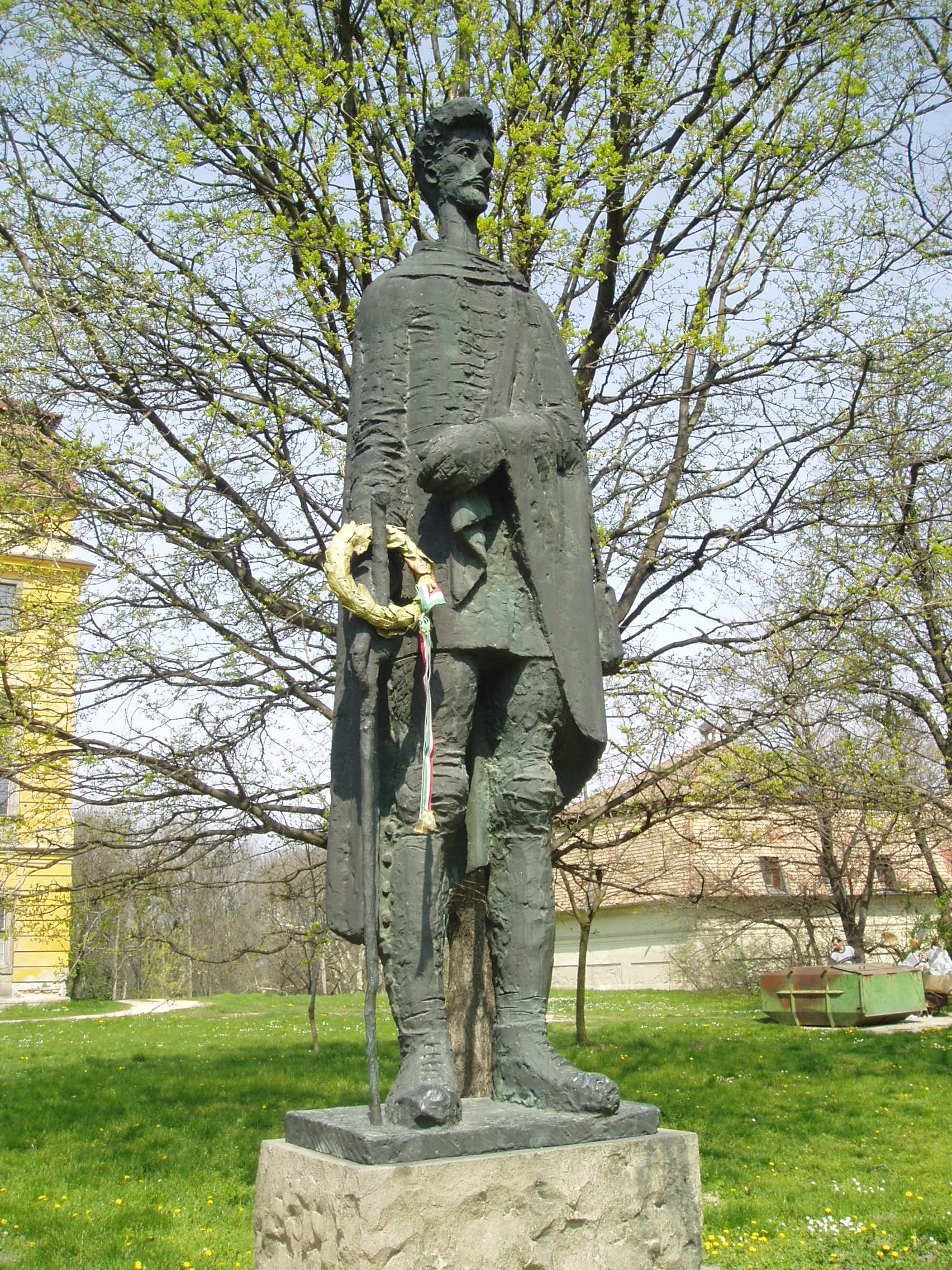 Nyilvános 1195 | 3123 | Pápa, Fő tér 1-3. Jókai-oszlop | Az Esterházy kastély előtti, a Fő tér felé néző parkban két egykori pápai diák - Jókai Mór és Petőfi Sándor - emlékére állított szoborkompozíció áll. A Petőfi Sándort megörökítő bronzszobor a szintén pápai diák Somogyi József szobrászművész alkotása. A fénykép 2007 áprilisában készült. Felh. irod.: Németh Adél - Szabó Lajos: Pápa. Bp. Panoráma, 1989 |