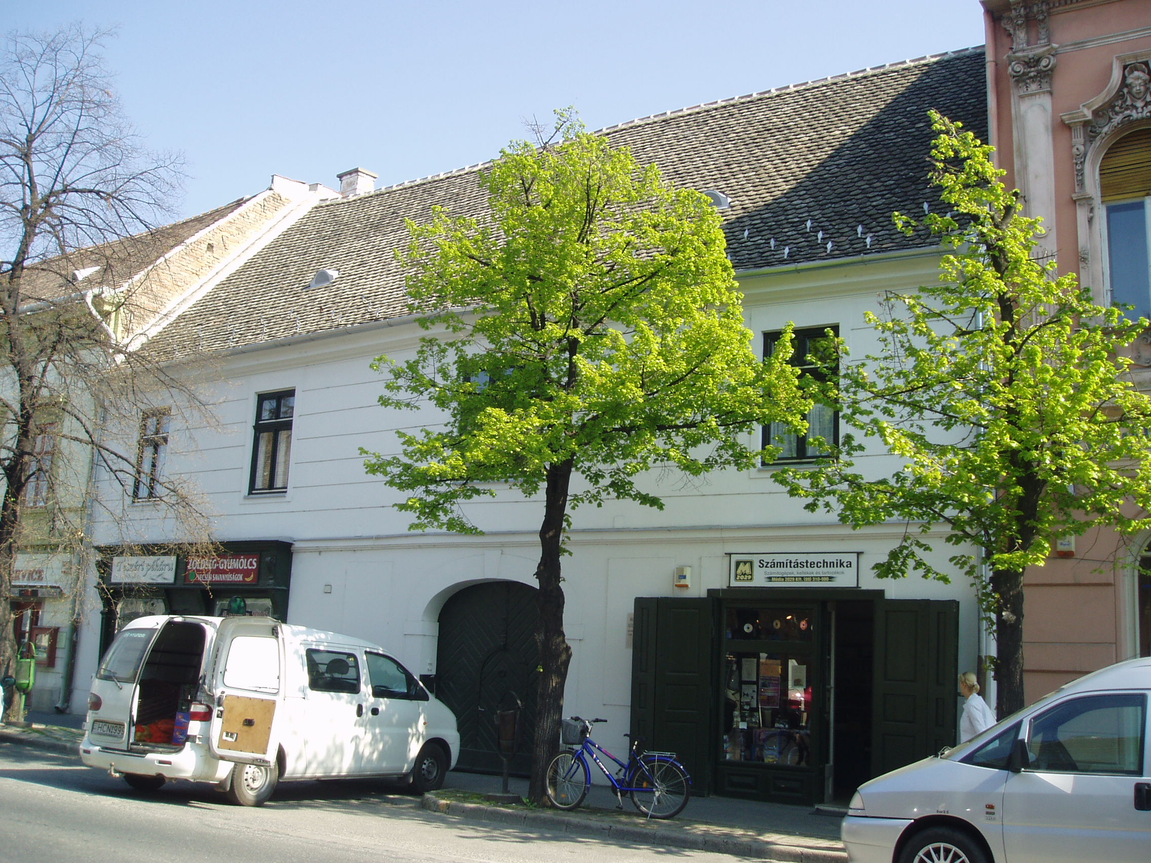 Nyilvános 1131 | 1814 | Pápa, Fő utca 6. Református lelkészlak | A református lelkészlak egyszerű, egyemeletes épület,. 1750 körül emelték barokk stílusban; sajnos, az átépítések következtében nagyrészt elvesztette eredeti arculatát. Udvarán - és a Fő utca 4. számú ház udvarán - áll a Református Ótemplom, azon a helyen, ahol 1718-1752 között egy fészer szolgált az istentisztelet helyszínéül. Az ótemplom felépítését II. József türelmi rendelete tette lehetővé 1783-ban. A rendeletben előírtak betartásával a templom nem az utca homlokzatvonalában, hanem zárt udvaron és torony nélkül épülhetett csak fel. A templom a késő barokk - kora klasszicista stílusú református templomok legkorábbi képviselője. 1972-ben nyitották meg benne a Református Egyháztörténeti Múzeum kiállítását. Sajnos jelenleg (2007. április) sem az épület, sem a kiállítás nem látogatható "takarékossági okok" miatt (fényképet sem tudtam róla készíteni, csak az utcafrontról: K. K.). A fénykép 2007 áprilisában készült. Felh. irod.: Németh Adél - Szabó Lajos: Pápa. Bp. Panoráma, 1989 |