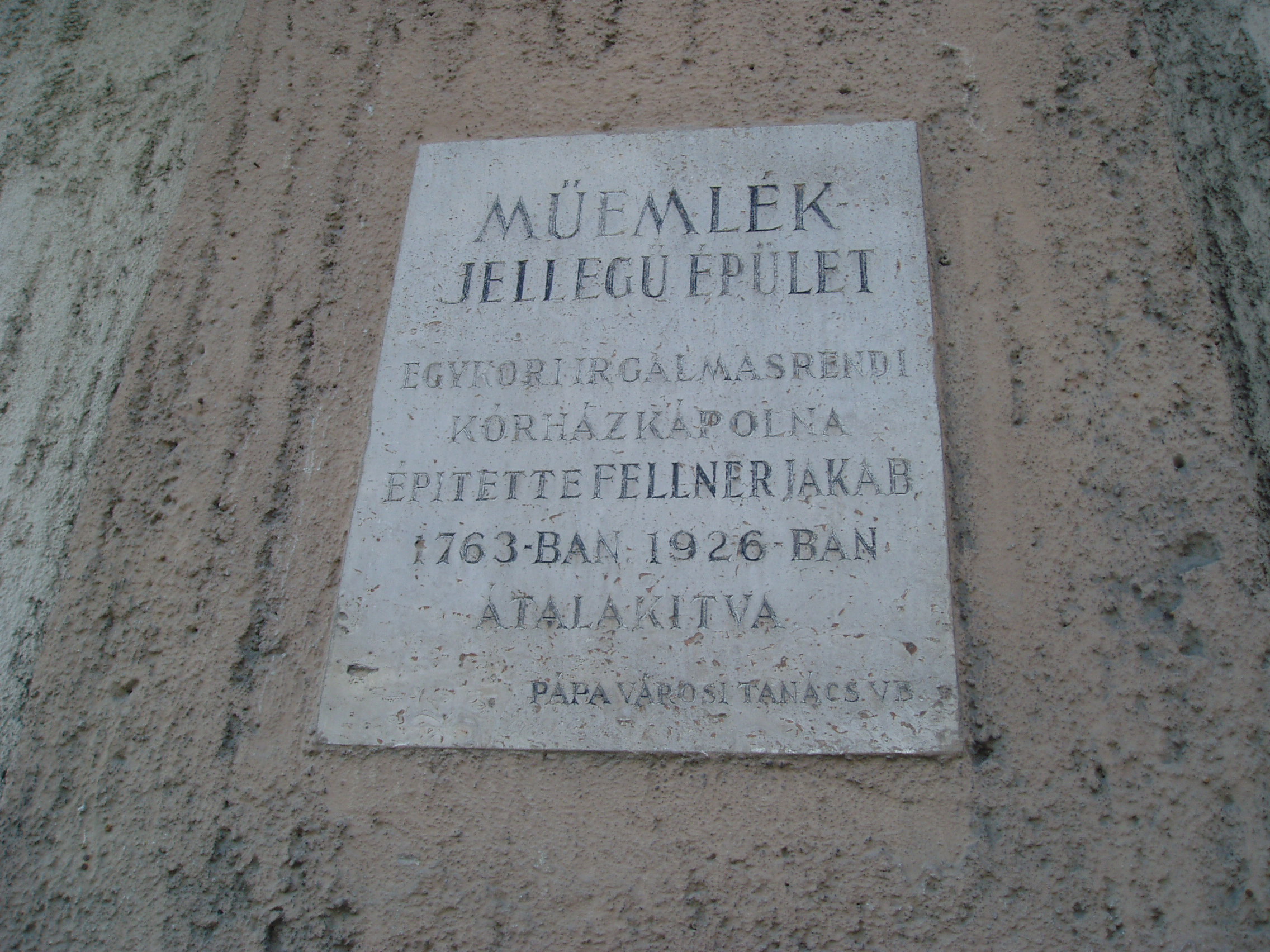 Nyilvános 1104 | 1699 | Pápa, Jókai utca 7. | A kórház régi épülete 1763-1768 között készült el Fellner Jakab tervei alapján. Az irgalmas rendet 1730 körül gróf Esterházy Ferenc telepítette le Pápán az akkor gyakori pestises betegek ápolására. Első kórházuk is ezen a helyen volt, melynek céljára a Zöldfa vendéglőt alakították át. A mai kórházat 1757-ben alapította Eszterházy Károly, Pápa ura, akkor váci, majd egri püspök (lásd még: Pápa, Jókai u. 9.). A Fellner Jakab által épített, azóta kibővített és átalakított épület egyemeletes, szárnyai négyszögű udvart vesznek körül. A ma is látható torony az egykori kórházkápolnához tartozott. A képen az erre vonatkozó műemléki tábla látható. A fénykép 2007 áprilisában készült. Felh. irod.: Németh Adél - Szabó Lajos: Pápa. Bp. Panoráma, 1989 |