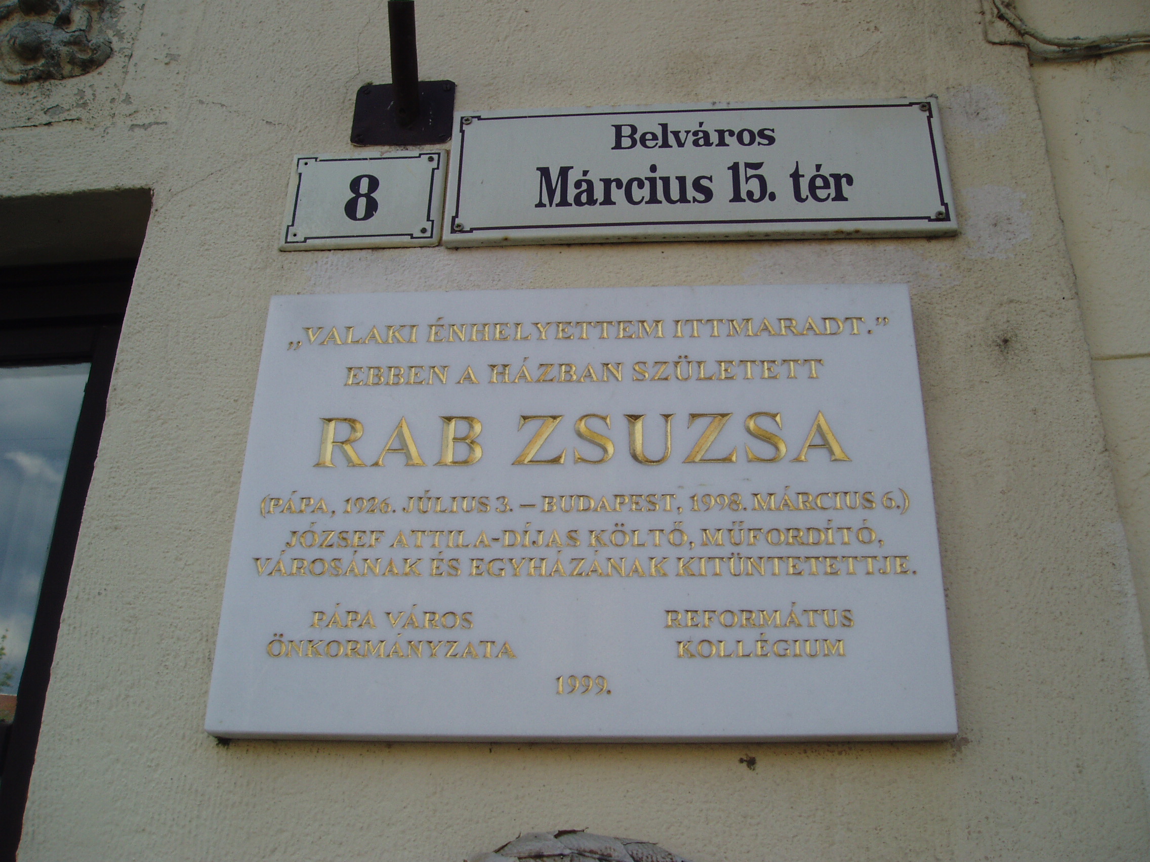 Nyilvános 1112 | 1725 | Pápa, Március 15. tér 8. | Az emeletes saroklakóház 1870 körül épült. Ebben a házban született 1923. július 3-án Rab Zsuzsa költő, műfordító. Édesapja, Rab István 1886-1957) a második világháborút megelőző időszakban a Pápai Református Kollégium Gimnáziumának (lásd: Pápa, Március 15. tér 9.) legendás hírű igazgatója, édesanyja a pápai templomépítő–gondnok, Jilek Ferenc lánya. Tanulmányait szülővárosában kezdte, majd 1944–ben a Kecskeméti Református Nőnevelő Intézetben érettségizett. A budapesti egyetem orvostudományi szakára iratkozott be, majd egy év elteltével a bölcsészkar orosz szakos hallgatója lett. A nyelvek, az irodalmak szépségével édesapja ismertette meg. Bizonyára nagy része volt abban, hogy a fiatal kamaszlány 16 éves korában saját verseskötetben tárta fel diáktársainak a szerelemről, otthonról, költészetről fogant lírai impresszióit. A fény felé című kötetet 17 évig nem követhette másik. A második világháború után megváltozott rendszerben Rab Zsuzsa egyetemi tanulmányaihoz állami támogatást nem kaphatott. Édesapját nyugdíj nélkül bocsájtották el, a családot osztályidegennek nyilvánították. Egyetemistaként takarításból, kisebb diákok tanításából, alkalmi munkákból élt. Tehetségének és kitartó szorgalmának köszönhetően 1955–ben robbanásszerűen tört be a műfordítás–irodalomba a magyar nyelven addig ismeretlen Szergej Jeszenyin verseinek fordításával. Ezután sorra jelentek meg műfordításai. Hihetetlenül gazdag életművet szakított félbe a halál 1998. március 5-én. Rab Zsuzsa szeretett iskolájára hagyta könyvtárának jelentős hányadát (a Petőfi u. 13. számú épületben, az ún. Ókollégiumban található), vagyonának egy részéből pedig létrehozta a Rab István Alapítványt, amellyel a latinban jeleskedő ifjakat kívánta támogatni. A fénykép 2007 áprilisában készült. Felh. irod.: Németh Adél - Szabó Lajos: Pápa. Bp. Panoráma, 1989 Rab Zsuzsa. = Olvadás. A Pápai Református Gimnázium diáklapja. 2003. 8. |