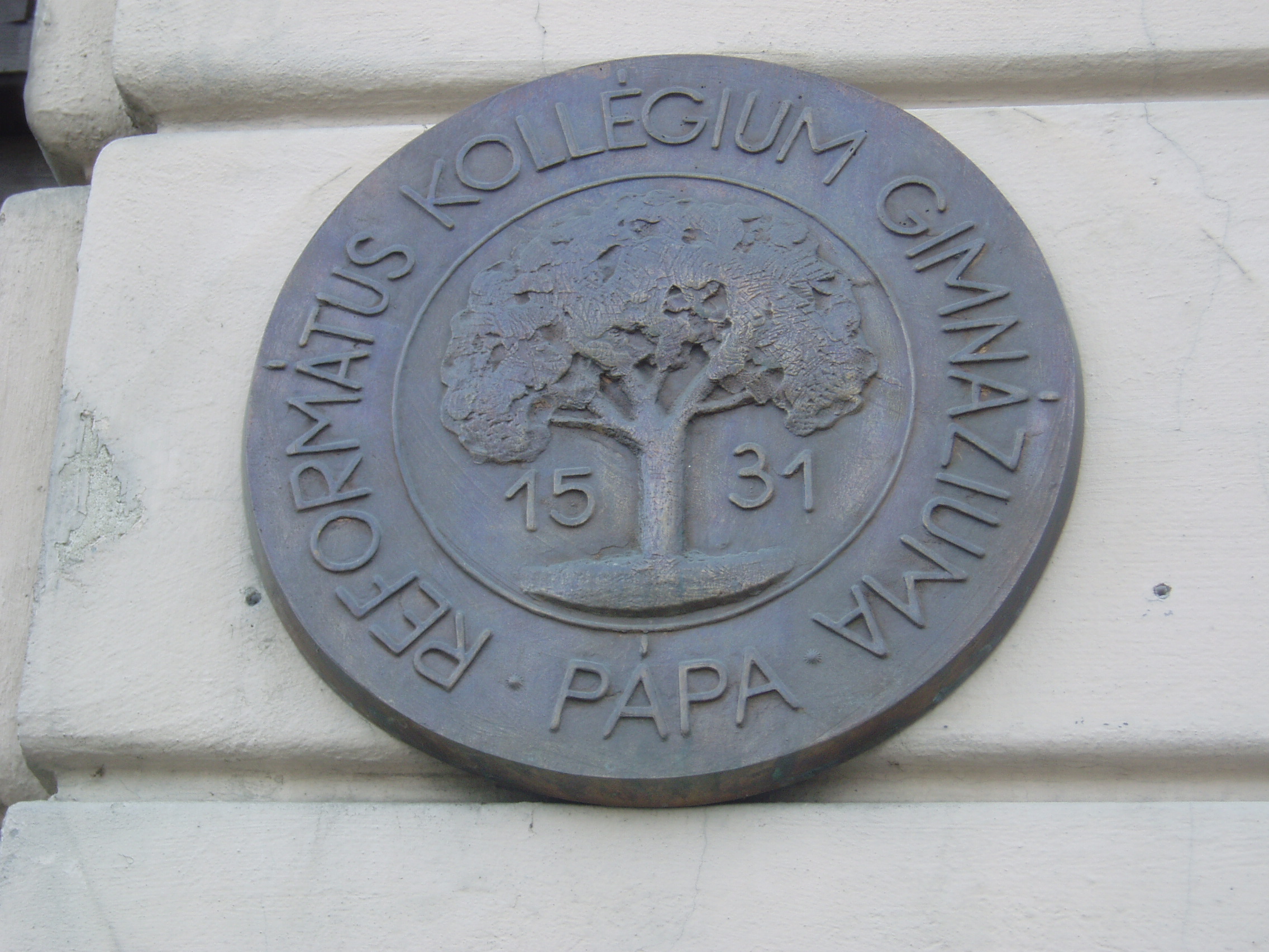 Nyilvános 1156 | 1906 | Pápa, Március 15. tér 9. Pápai Református Kollégium Gimnáziuma | A híres pápai Református Kollégium első épülete 1531 és 1752 között a mai Ruszek közben, a Lábasház épületének helyén állott. 1752-ben - Mária Terézia rendeletének következtében, amely megszüntette a szabad vallásgyakorlást - harminckét évig csak a közeli Adásztevelen működhetett. 1784-ben, II. József türelmi rendeletének köszönhetően térhetett vissza az iskola Pápára, s hamarosan felépült a ma Ókollégiumként ismert épület (lásd: Pápa, Petőfi u. 13.), amelyben 1794-ben indulhatott meg az oktatás. Az intézmény 1857-ig működött ott, ekkor átköltözött a Március 15. tér 13-15. számú házba, az ún. Nátus-ba, majd 1895-ben utolsó végleles helyére, ide, a Március 15. tér 9. számú monumentális új épületbe. A főbejárat mellett a Kollégium jelképe, egy eperfa sziluettje látható az alapítás évszámával. A jelkép eredete az adászteveli száműzetés idejére nyúlik vissza: mivel a teveli kicsi iskolában nem fért el a diákság, az órákat kezdetben egy eperfa alatt tartották. Az iskola jeligéjét: "Istennek, hazának, tudománynak" egykori diákja, Jókai Mór fogalmazta meg. A fénykép 2007 áprilisában készült. Felh. irod.: Németh Adél - Szabó Lajos: Pápa. Bp. Panoráma, 1989 http://refi-papa.hu |