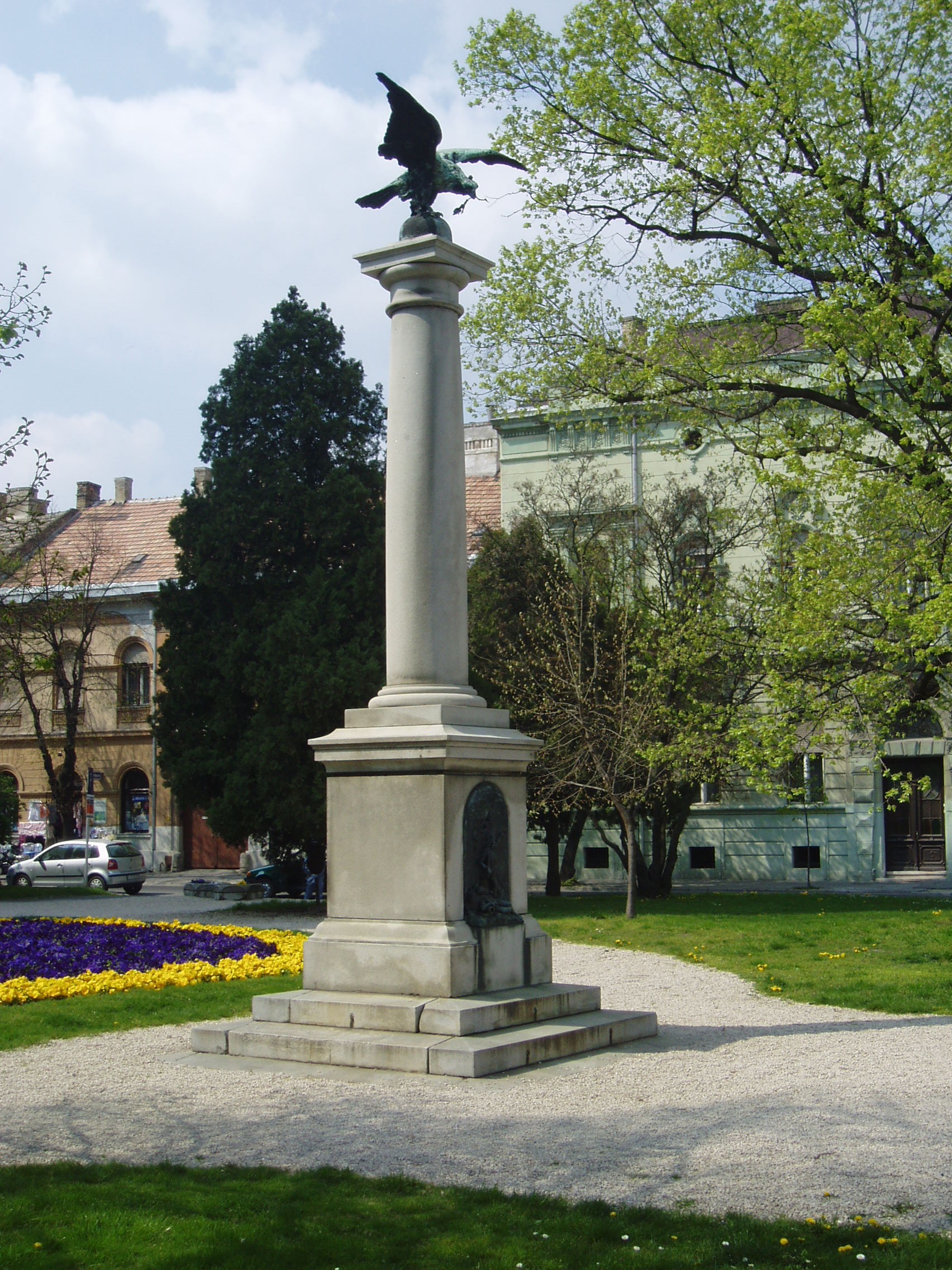 Nyilvános 1206 | 2154 | Pápa, Március 15. tér: Honvéd emlékmű | A református templom előtti kis parkban, a Jókai utca felőli oldalon álló Honvéd emlékmű ifj. Vastagh György alkotása. 1896-ban állították fel a Pápa melletti ihászi csata emlékére. A hengeres oszlopon kiterjesztett szárnyú, bronz turulmadár ül. A négyzetes talapzaton levő bronzrelief csatajelenetet ábrázol. A szabadságharc egyetlen Veszprém megyei csatája 1849. június 27-én zajlott le Ihász térségében (korábban, június 13-án Kmetty György győzelmet aratott Csornán). Június 27-én az ihászi pusztán Kmetty megtámadta a Marcaltő elfoglalására siető Schütte osztrák tábornokot. A csata nem végződött egyértelmű győzelemmel, de a magyaroknak heves ágyútűzzel sikerült hátráltatni az osztákokat. Azonban az erős osztrák lovasság Kmetty csapatait végül visszanyomta Pápa felé. A fénykép 2007 áprilisában készült. Felh. irod.: Németh Adél - Szabó Lajos: Pápa. Bp. Panoráma, 1989 |