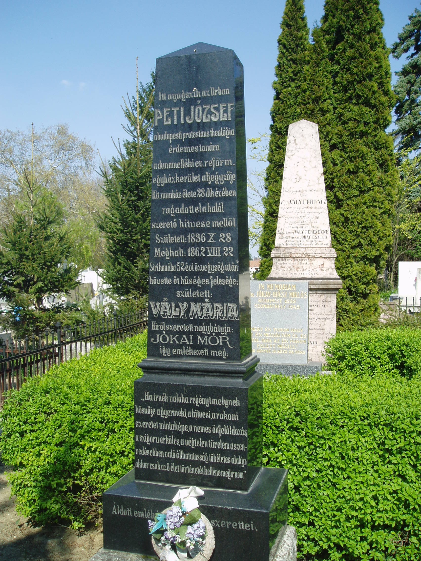 Nyilvános 1406 | 3724 | Pápa, Alsóvárosi temető: Vály Mari sírja | A Jókai utcáról nyíló Temető utca vezet a XIX. század elején megnyílt Alsóvárosi köztemetőbe. A város sok neves személyiségének van itt a sírja. Itt nyugszik Vály Mari (Komárom, 1840. nov. 17. – Pápa, 1915. máj. 17.) emlékiratíró, Jókai Mór unokahúga (Eszter nővérének lánya, apja Vály Ferenc tanár). Férjének és gyermekének korai halála után Jókaiékhoz költözött, háztartásuk vezetésében segédkezett. Nagybátyja életét terjedelmes emlékiratban örökítette meg, amelyből szemelvényes kiadásban jelent meg: Emlékeim Jókai Mórról címmel csak részletek jelentek meg 1955-ben. Sírkövén nagybátyjának sorai olvashatók. Ugyanitt nyugszik férje, Peti József (Komlósd, 1831. okt. 24. – Pest, 1862. aug. 22.) tanár. Tanulmányait Csurgón kezdte, 1850-től Pápán, Bécsben és Bazelben folytatta, ahol teológiát is hallgatott. A pápai gimnáziumban 1856-ban, egy év múlva Kecskeméten, 1859-től Pesten a teológia tanára. A Duna-melléki Egyházkerület 1861-ben aljegyzővé választotta. Több tudományos értekezést írt, melyek a tiszántúli egyházi folyóiratokban és évkönyvekben jelentek meg. A fénykép 2007 áprilisában készült. Felh. irod.: Németh Adél - Szabó Lajos: Pápa. Bp. Panoráma, 1989 Veszprém megyei életrajzi lexikon. Veszprém, Veszprém Megyei Önkormányzat Közgyűlése, 1998 |