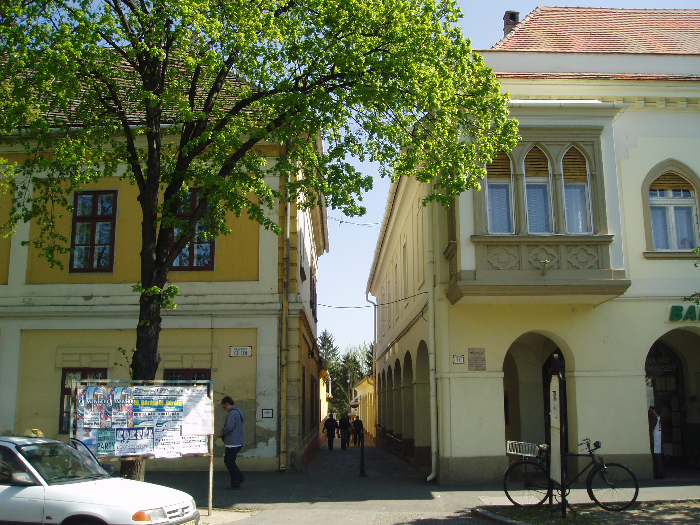 Nyilvános 1088 | 2223 | Pápa, Ruszek köz (a Fő tér felől) | A Fő tér 11. és 12. számú épületek között nyílik a Ruszek köz. A bal oldali, egyemeletes épület (Fő tér 11.) a római katolikus plébániaház. A XVI. századi eredetű épület mai, jellegzetesen barokk megjelenését a XVIII. században nyerte. Jobbra az ún. Lábasház (Fő tér 12.) látható. A XVIII. századi, barokk stílusú épületet a keskeny Ruszek köz felőli oldalon hosszanti és harántívekkel ritmusosan tagolt folyosó tesz egységes megjelenésűvé. Valaha élénk kereskedelmi élet folyt itt. Az épület Fő tér felőli homlokzata a XIX. században neogótikus külsőt kapott. A Lábasház helyén volt a híres református kollégium első épülete. Eredetileg katolikus iskola volt, amely 1531-ben alakult át a protestánsok tanintézetévé, majd egy hosszabb fejlődési idő alatt, 1585-ben főiskolábá vált. 1752-ig állt ezen a helyen. Mária Terézia rendeletére ekkor szüntették meg a reformátusok vallásgyakorlatát, s az iskolát a közeli Adásztevelre száműzték, ott működött harminckét évig. 1784-ben térhetett vissza Pápára, s hamarosan felépült új otthona (lásd: Pápa, Petőfi u. 13.). Besétálva a Ruszek közbe, a nagy múltú iskola emléktáblája a bal oldali épületen olvasható. A fénykép 2007 áprilisában készült. Felh. irod.: Németh Adél - Szabó Lajos: Pápa. Bp. Panoráma, 1989 |
