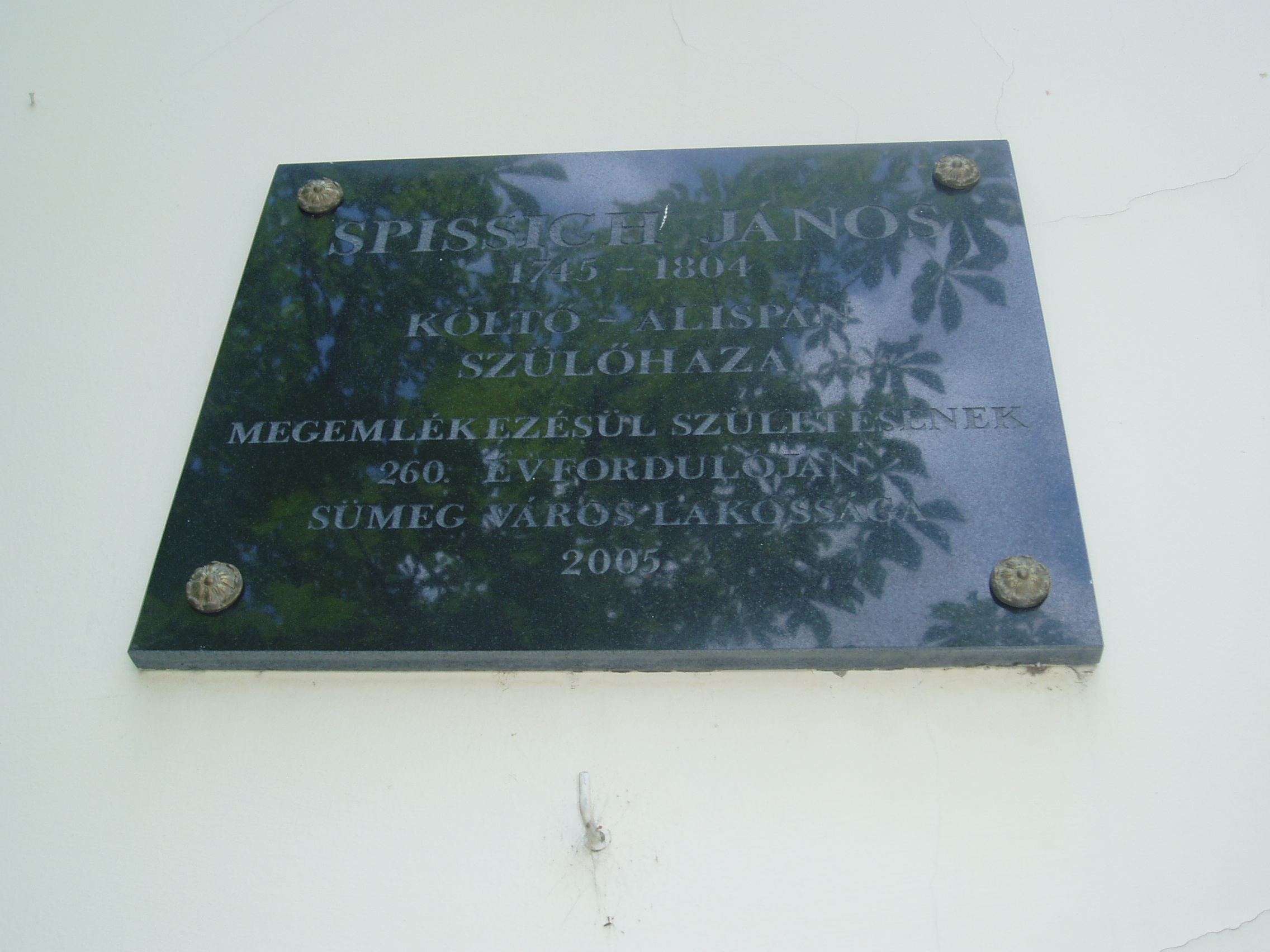 Nyilvános 1101 | 1667 | Sümeg, Deák F. u. 6. | Mint a homlokzaton elhelyezett emléktáblán is olvasható, ebben a házban születetett 1745-ben Spissich János költő-alispán. Spissich János (Sümeg, 1745. márc. 28 – Kisgörbő, 1804. ápr. 25.) költő, alispán. Régi horvát nemesi családból származott. Apja Sopron megyei szolgabíró. 1761-ben Trencsében lépett a jezsuita rendbe, Kőszegen, Gyöngyösön, Komáromban tanított. 1771-ben megvált a rendtől, Zala vármegyében aljegyző, 1780-tól főjegyző. 1781-től az Eltz-uradalom (Szlavónia) jószágkormányzója, majd Zala megyei alispán, 1790–1791-ben országgyűlési követ. A francia forradalommal rokonszenvező ellenzéki magatartása miatt kegyvesztetté vált. József nádor vizsgálatot rendelt el ellene, de tisztázni tudta magát. 1797. ápr. 12-i zalai megyegyűlés elmozdította az alispánságból, 1798-tól kisgörbői birtokán élt. Szabadkőműves, a zalaegerszegi nagypáholy vezetője. Baráti viszonyban volt Kazinczyval, Pálóczi Horváthtal. Jelen volt Széchényi Ferencnél tartott ülésen, amelyen a tudós társaság felállítását tervezték. Versei közül A jövendő századnak c. emelkedik ki. Beszélt a magyaron kívül olasz, német, latin, szláv és orosz nyelven. A fénykép 2007 júniusában készült. Felh. irod.: Veszprém megyei életrajzi lexikon. Veszprém, 1998 |