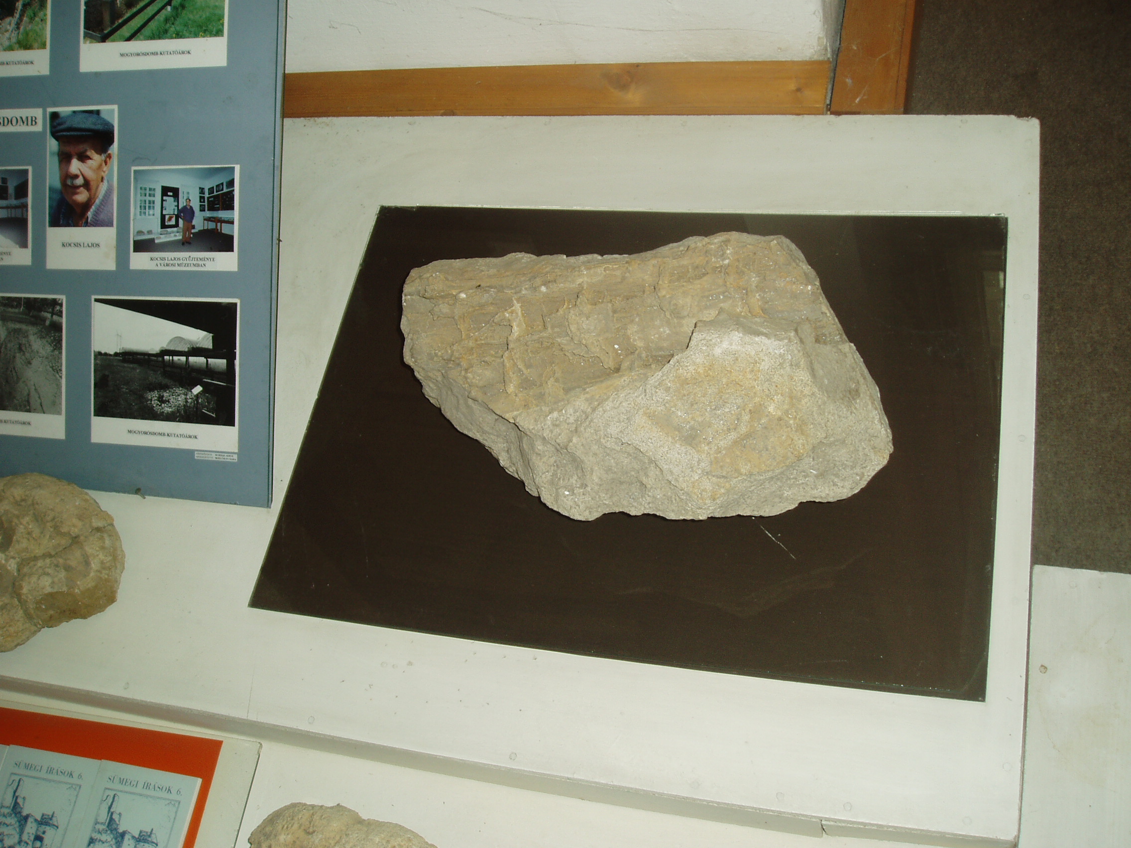 Nyilvános 1089 | 1618 | Sümeg, Kisfaludy tér 2. Városi Múzeum | A Kisfaludy Sándor szülőházában lévő múzeum külön teremben mutatja be Kocsis Lajos geológiai gyűjteményét. Kocsis Lajos nyugdíjas bányász, aki hosszú évtizedeken keresztül lelkesen gyűjtötte a Bakony geológiai múltját őrző kövületeket. Magángyűjteményéből 1984-ben nyílt állandó kiállítás. Az egykori élet nyomai mellett a velük egyidőben képződött, iparilag jelentős ásványi nyersanyagok mintapéldányai is láthatók itt: bauxit, barnaszén, mangánérc. A múzeum tulajdonába jutott gyűjtemény közel 4000 tételt számlál. A fénykép 2007 júniusában készült. Felh. irod.: Sümegi kalauz. Sümeg, Sümegi Fórum Alapítvány, 1993 |