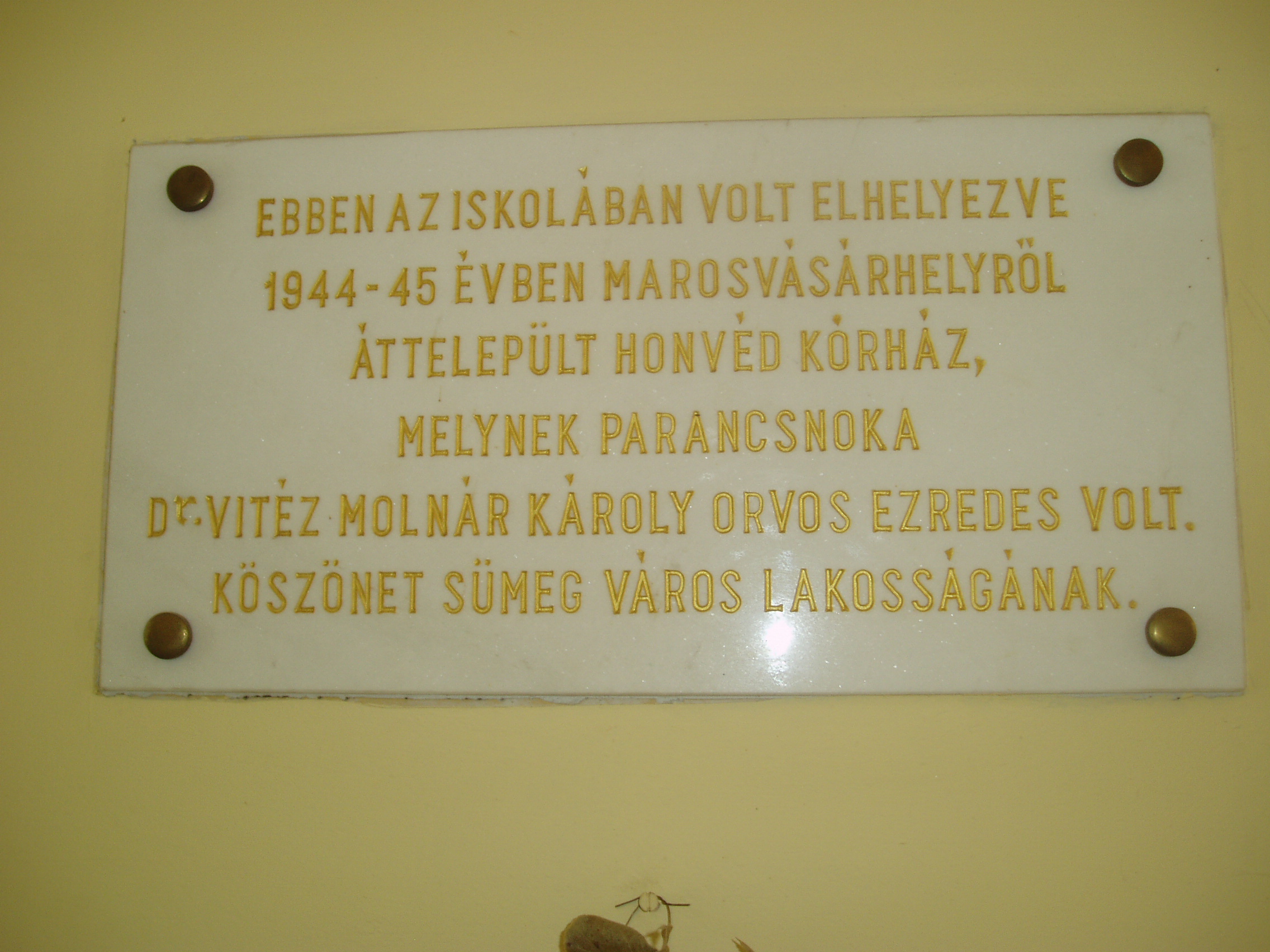 Nyilvános 1098 | 1628 | Sümeg, Mártírok útja 1. Kisfaludy Sándor Gimnázium | A Kossuth Lajos utca és a Mártírok útja sarkán magasodó többszintes épület a sümegi oktatás legimpozánsabb hajléka. Az iskola előcsarnokában több emléktáblát, udvarán pedig Kisfaludy Sándor szobrát helyezték el. A képen látható márványtábla a második világháborúra emlékeztet: az iskola épületében helyezték el 1944/45-ben a Marosvásárhelyről áttelepült honvéd kórházat. A fénykép 2007 júniusában készült. Felh. irod.: Koppány Tibor - Kozák Károly: Sümeg útikalauz. Veszprém, Idegenforgalmi Hivatal, 1965 Látnivalók Veszprém megyében. Miskolc, Well-PRess, 2004 Sümegi kalauz. Sümeg, Sümegi Fórum alapítvány, 1993 |