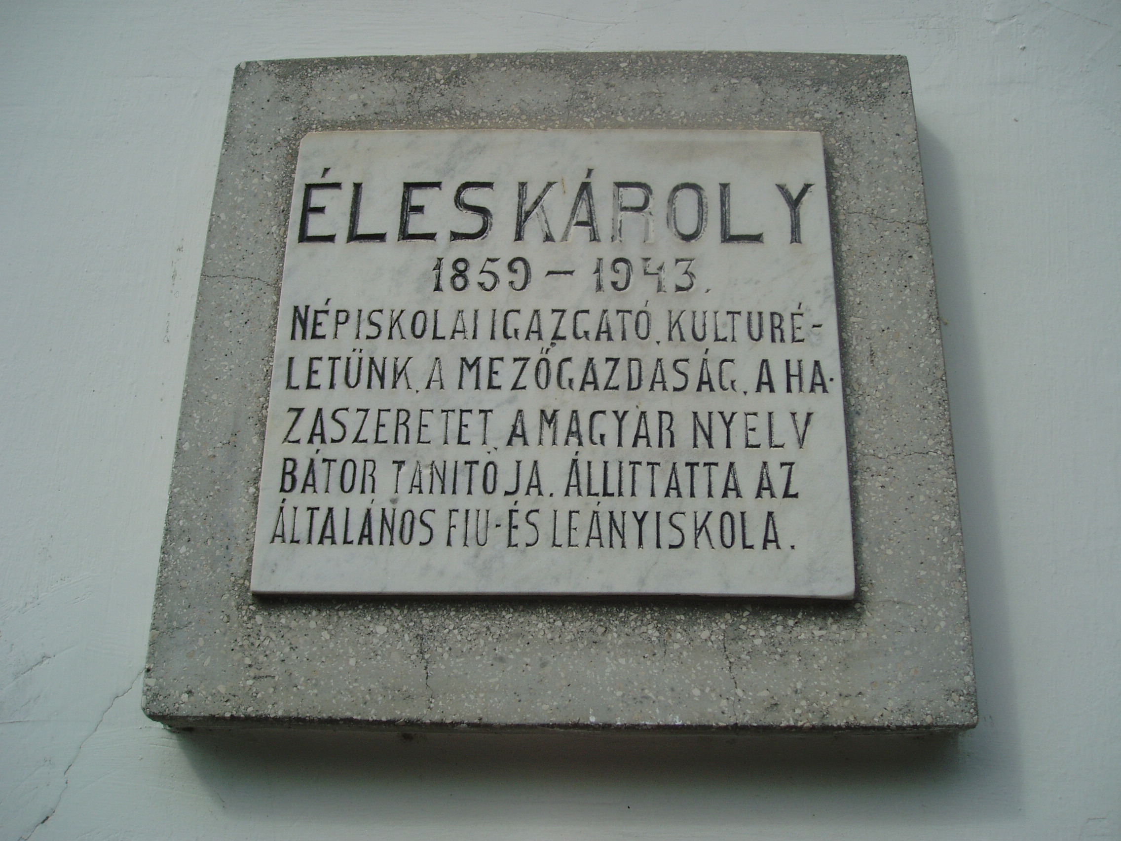 Nyilvános 1118 | 1743 | Sümeg, Panteonfal. Éles Károly emléktáblája | A Kisfaludy téren, Kisfaludy Sándor szülőháza előtt alakították ki Sümeg Panteonfalát. A képen Éles Károly emléktáblája látható (1955). Felirata: ÉLES KÁROLY 1859-1943. Népiskolai igazgató, kulturéletünk, a mezőgazgdaság, a hazaszeretet, a magyar nyelv bátor tanítója. Állíttatta az Általános Fiu- és Leányiskola. Éles Károly (Sümeg, 1859. dec. 16. – Sümeg, 1943. máj.) tanító. Eredeti családneve Scharf. Csurgón szerzett tanítói oklevelet, 1878–1883 között Sümegen tanított, majd Perkátán és Pakson dolgozott. 1888-ban visszatért szülővárosába. Az elemi iskola tanítója, 1916-tól igazgatója. Pedagógiai szakírói tevékenysége mellett etnográfiai és helytörténeti kutatásokat is végzett. Szerkesztője volt a Sümeg–Szent-Gróth, majd a Sümeg és Vidéke című lapoknak. A fénykép 2007 júniusában készült. Felh. irod.: Koppány Tibor - Kozák Károly: Sümeg útikalauz. Veszprém, Idegenforgalmi Hivatal, 1965 Látnivalók Veszprém megyében. Miskolc, Well-PRess, 2004 Veszprém megyei életrajzi lexikon. Veszprém, Veszprém Megyei Önkormányzat Közgyűlése, 1998 www.ekmk.hu/emlekhely/Emlekhelyek.html |