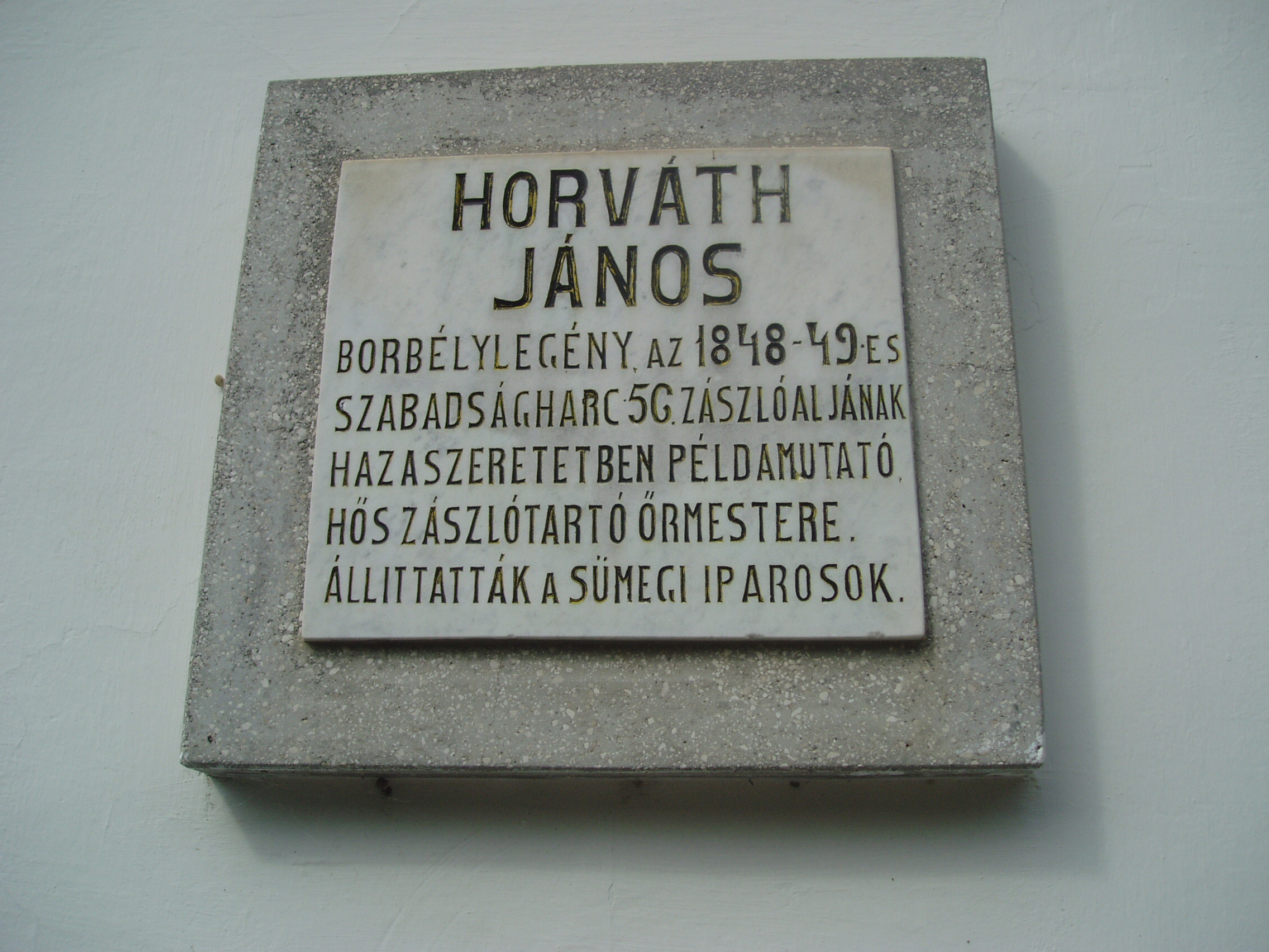 Nyilvános 1105 | 1624 | Sümeg, Panteonfal. Horváth János emléktáblája | A Kisfaludy téren, Kisfaludy Sándor szülőháza előtt alakították ki Sümeg Panteonfalát. A képen Horváth János 1955-ben elhelyezett emléktáblája látható (a Veszprém megyei életrajzi lexikon nem említi). Felirata: HORVÁTH JÁNOS borbélylegény, az 1849-49-es szabadságharc 56. zászlóaljának hazaszeretetben példamutató, hős zászlótartó őrmestere. Állíttatták a sümegi iparosok. A fénykép 2007 júniusában készült. Felh. irod.: Koppány Tibor - Kozák Károly: Sümeg útikalauz. Veszprém, Idegenforgalmi Hivatal, 1965 Látnivalók Veszprém megyében. Miskolc, Well-PRess, 2004 Veszprém megyei életrajzi lexikon. Veszprém, Veszprém Megyei Önkormányzat Közgyűlése, 1998 www.ekmk.hu/emlekhely/Emlekhelyek.html |