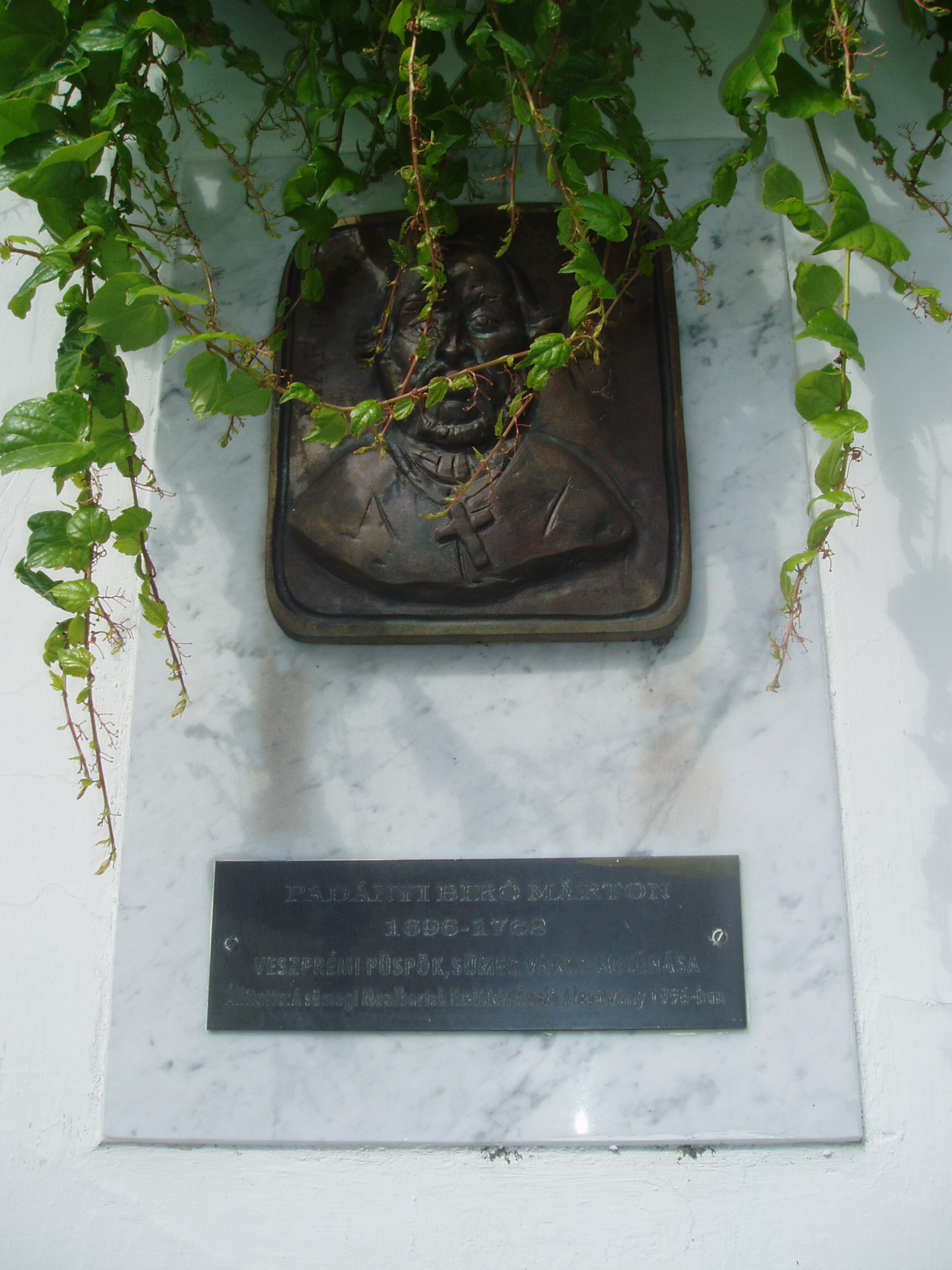 Nyilvános 1115 | 1605 | Sümeg, Panteonfal. Padányi Bíró Márton emléktáblája | A Kisfaludy téren, Kisfaludy Sándor szülőháza előtt alakították ki Sümeg Panteonfalát. A képen Padányi Bíró Márton emléktáblája látható, Máger Ágnes alkotása (1996). Felirata: PADÁNYI BIRÓ MÁRTON, 1696-1762, veszprémi püspök, Sümeg város mecénása Padányi Bíró Márton (Padány, 1696. ápr. 15. – Sümeg, 1762. aug. 10.) író, püspök, főispán. 1729-ben nevezték ki veszprémi kanonokká és felsőörsi préposttá. 1745. márciusától a veszprémi egyházmegye püspöke és a megye főispánja. A káptalannal és a várossal sokat hadakozott, ezért szívesebben tartózkodott Sümegen, ahol megépíttette a ma is álló püspöki palotát (lásd: Sümeg, Szent István tér 10.) és a plébániatemplomot (lásd: Sümeg, Bíró M. u. 1.). Püspöki tevékenységét az egyházmegye látogatásával kezdte, amelynek anyaga 10 hatalmas kötetet tesz ki. Templomok, és iskolák tucatjait építtette vagy állíttatta helyre, amelyeknek jelentős részét a protestánsoktól, nem egy esetben erőszakos, hatalmi eszközökkel szerezte vissza. Az államhatalomnak az eretnekekkel szembeni kötelességeit fejtette ki az Enchiridion de fide c. munkájában, amely 1750-ben jelent meg. A könyv, vallási türelmetlensége miatt nagy vihart kavart, nemzetközi tiltakozásra a királynő elkoboztatta. Nagyvonalúan támogatott írókat műveik kiadásában, művészeket az alkotásban. Maga is sokat írt. Sümegen a plébániatemplom előtt áll bronz mellszobra, Marton László alkotása. A veszprémi székesegyház altemplomában nyugszik. A fénykép 2007 júniusában készült. Felh. irod.: Koppány Tibor - Kozák Károly: Sümeg útikalauz. Veszprém, Idegenforgalmi Hivatal, 1965 Látnivalók Veszprém megyében. Miskolc, Well-PRess, 2004 Veszprém megyei életrajzi lexikon. Veszprém, Veszprém Megyei Önkormányzat Közgyűlése, 1998 www.ekmk.hu/emlekhely/Emlekhelyek.html |