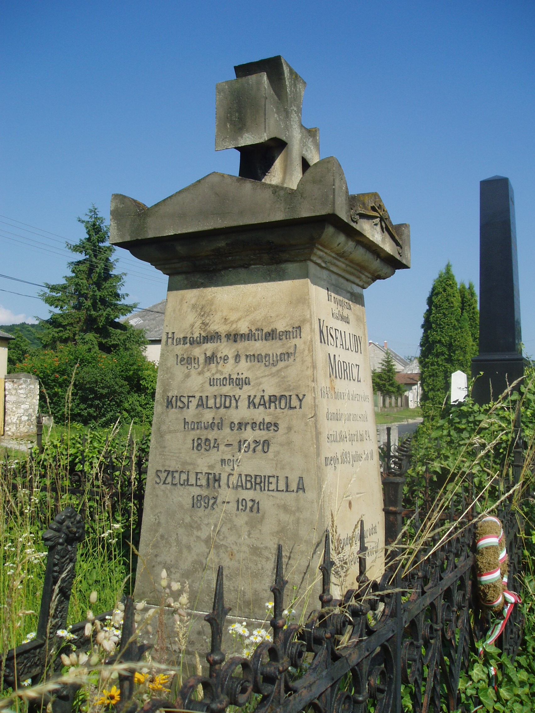 Nyilvános 1106 | 1778 | Sümeg, Temető. Kisfaludy Mór sírja | Sümeg délkeleti határában, a Tapolcára vezető út mellett emelkedő lankás domboldalon találjuk a város köztemetőjét. Helyét még Bíró Márton püspök jelölte ki; jelentősebb számban a XIX. század eleje óta kezdtek ide temetkezni. A temetődomb tetején áll az 1816-ban épített, későbarokk stílusú temetőkápolna. Körülötte a sümegi élet utolsó két évszázada szinte valamennyi híres személyiségének sírja fellelhető. A Tapolcai útra nyíló alsó temetőkapu mellett található Kisfaludy Mór és családja sírkertje. Az empire stílusú sírkő eredetileg Szegedy Róza nyughelyét jelölte. Amikor az 1900-as évek elején egyesítették sírját férjéével, átfaragták sírkövét, s azóta Kisfaludy Mór és családja sírját jelöli. Itt nyugszik Kisfaludy Mór (1814-1893) 1848-as honvéd alezredes, dandárparancsnok, Kisfaludy Sándor unokaöccse. Részt vett az isaszegi, a kápolnai, a pákozdi harcokban, jelen volt Budavár visszafoglalásánál. Aradon halálra ítélték, amit később 16 év várfogságra változtattak. Ismerősei közbenjárására két év múlva kiszabadult, s Sümegre költözött. Véglegesen visszavonult a közélettől, gazdálkodással foglalkozott. Több családtagja is itt van eltemetve. A fénykép 2007 júniusában készült. Felh. irod.: Koppány Tibor - Kozák Károly: Sümeg útikalauz. Veszprém, Idegenforgalmi Hivatal, 1965 Sümegi kalauz. Sümeg, Sümegi Fórum Alapítvány, 1993 Miklósi-Sikes Csaba: Kőbe vésett történelem. A sümegi városi temetők története és sírjelei 1950-ig. Sümeg, Sümegi Fórum Alapítvány, 2002 Veszprém megyei életrajzi lexikon. Veszprém, Veszprém Megyei Önkormányzat Közgyűlése, 1998 |