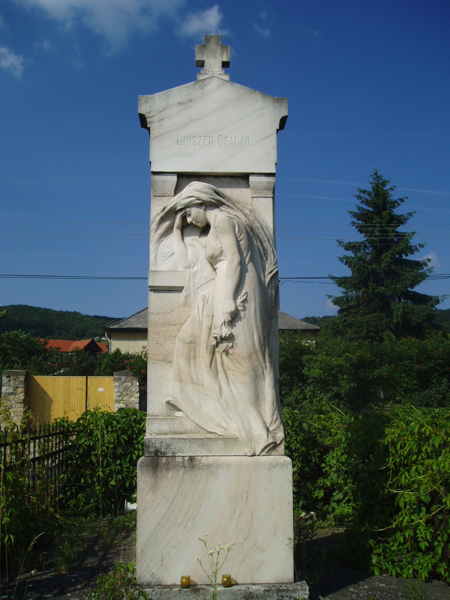 Nyilvános 1256 | 3283 | Sümeg, Temető. A Luiszer család sírja | Sümeg délkeleti határában, a Tapolcára vezető út mellett emelkedő lankás domboldalon találjuk a város köztemetőjét. Helyét még Bíró Márton püspök jelölte ki; jelentősebb számban a XIX. század eleje óta kezdtek ide temetkezni. A temetődomb tetején áll az 1816-ban épített, későbarokk stílusú temetőkápolna. Körülötte a sümegi élet utolsó két évszázada szinte valamennyi híres személyiségének sírja fellelhető. A temető egyik legszebb, halványrózsaszín márványból készült síremléke a Luiszer család egy tagját, Luiszer Karolinát (1882-1959), Darnay Kálmán múzeumalapító feleségét ábrázolja. Istók János szobrászművész alkotása (1911). E sírkő alatt pihen lányuk, Darnay Sára (1903-1990) és férje, Tóth Károly főorvos. Darnay Sára apjától örökölte a régiségek iránti szenvedélyét. Gazdag gyűjteményét 1981-ben Sümeg városának ajándékozta. A fénykép 2007 júniusában készült. Felh. irod.: Koppány Tibor - Kozák Károly: Sümeg útikalauz. Veszprém, Idegenforgalmi Hivatal, 1965 Sümegi kalauz. Sümeg, Sümegi Fórum Alapítvány, 1993 Miklósi-Sikes Csaba: Kőbe vésett történelem. A sümegi városi temetők története és sírjelei 1950-ig. Sümeg, Sümegi Fórum Alapítvány, 2002 Veszprém megyei életrajzi lexikon. Veszprém, Veszprém Megyei Önkormányzat Közgyűlése, 1998 |