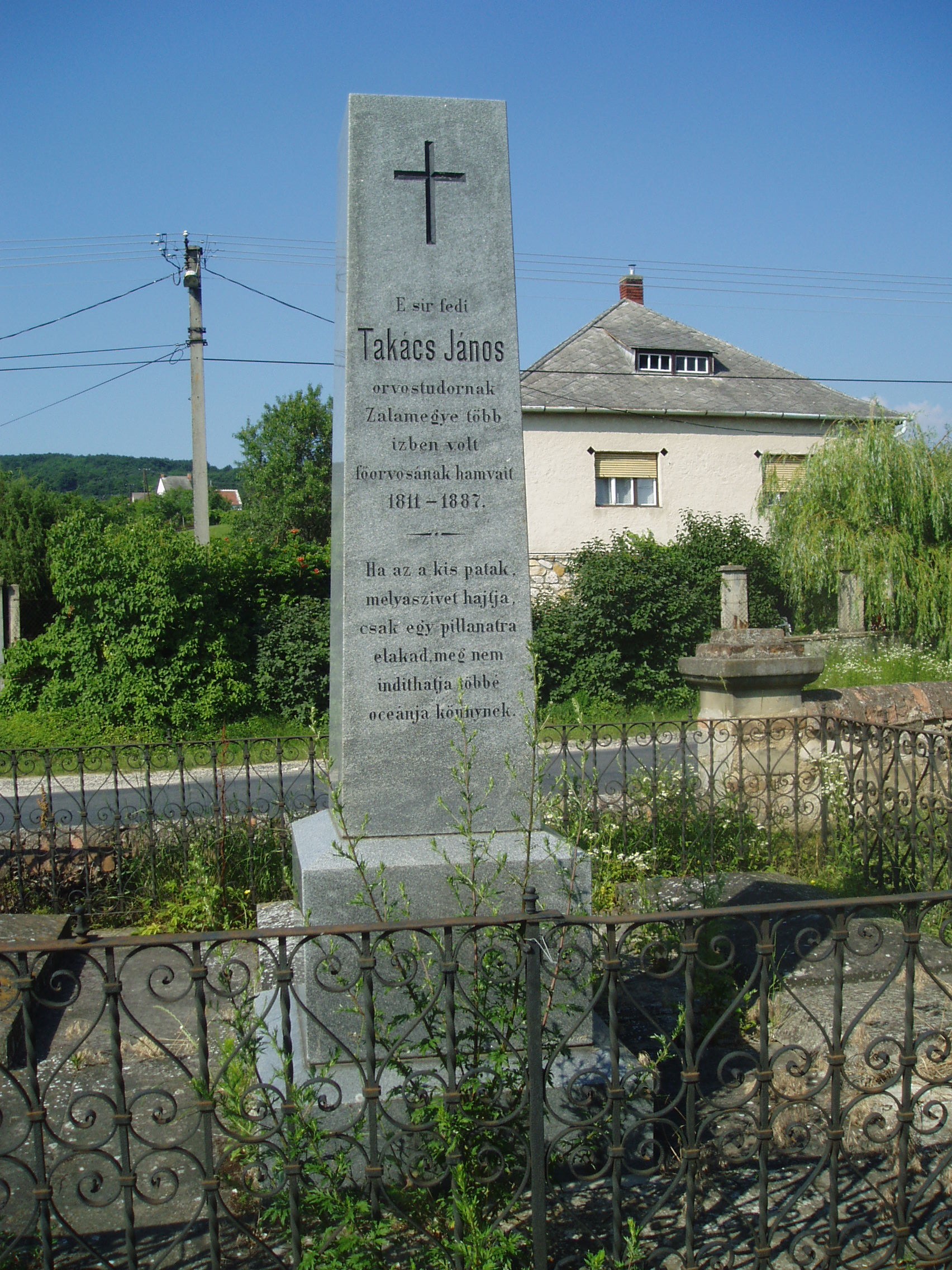 Nyilvános 1133 | 1872 | Sümeg, Temető. Takács János sírja | Sümeg délkeleti határában, a Tapolcára vezető út mellett emelkedő lankás domboldalon találjuk a város köztemetőjét. Helyét még Bíró Márton püspök jelölte ki; jelentősebb számban a XIX. század eleje óta kezdtek ide temetkezni. A temetődomb tetején áll az 1816-ban épített, későbarokk stílusú temetőkápolna. Körülötte a sümegi élet utolsó két évszázada szinte valamennyi híres személyiségének sírja fellelhető. Itt nyugszik Takács János (1811-1887) orvostudor, Zala megye egykori főorvosa. Sümegre az 1830-as években került, ahol háziorvosa lett az idősödő Kisfaludy Sándornak. A fénykép 2007 júniusában készült. Felh. irod.: Koppány Tibor - Kozák Károly: Sümeg útikalauz. Veszprém, Idegenforgalmi Hivatal, 1965 Sümegi kalauz. Sümeg, Sümegi Fórum Alapítvány, 1993 Miklósi-Sikes Csaba: Kőbe vésett történelem. A sümegi városi temetők története és sírjelei 1950-ig. Sümeg, Sümegi Fórum Alapítvány, 2002 Veszprém megyei életrajzi lexikon. Veszprém, Veszprém Megyei Önkormányzat Közgyűlése, 1998 |