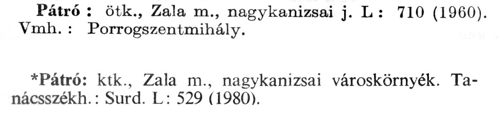 Nyilvános 2016 | 6070 | Rövid leírás | Teljes leírás (1 KB) | A szócikkek felismertetett szövege: (A csillag után az 1981-es kiadású kiegészítő kötetből származó szöveg következik) Pátró: ötk., Zala m., nagykanizsai j. L : 710 (1960). Vmh.: Porrogszentmihály. *Pátró: ktk., Zala m., nagykanizsai városkörnyék. Tanácsszékh.: Surd. L: 529 (1980). A szócikkek a következő lexikonból származnak: Cím: Új magyar lexikon Közreműködő: Berei Andor (1900-1979) (szerk.) Szerz. közl.: [szerk. Berei Andor et al.] Kiadás jelzés: 2. lny. Kiadás: Budapest : Akad. K., 1961-1962 Kötetei: 1., A - C 2., D - F 3., G - J 4., K - Me 5., Mf - R 6., S - Z 7. köt., A-Z Kiegészítő kötet (1972) Kiegészítő kötet, 1962÷1980 (1981) ETO jelzet: 03=945.11 Szakjelzet: 030 Cutter: U 28 Nyelv: magyar Megjegyzés: Bibliogr. a címszavak egy részének végén |