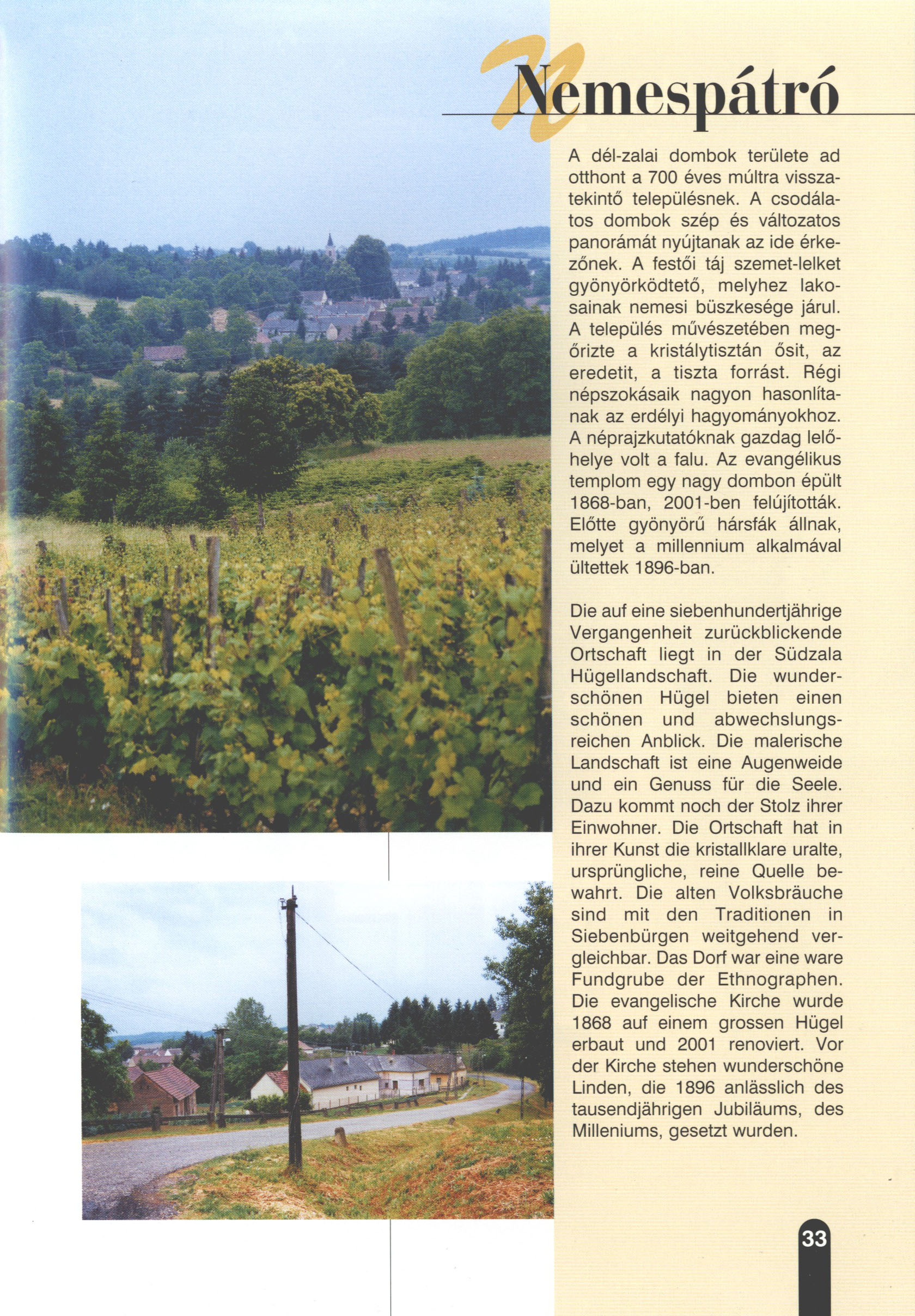 Nyilvános 2147 | 7391 | Nemespátró | Die auf eine siebenhundertjährige Vergangenheit zurückblickende Ortschaft liegt in der Südzala Hügellandschaft. Die wunderschönen Hügel bieten einen schönen und abwechslungsreichen Anblick. Die malerische Landschaft ist eine Augenweide und ein Genuss für die Seele. Dazu kommt noch der Stolz ihrer Einwohner. Die Ortschaft hat in ihrer Kunst die kristallklare uralte, ursprüngliche, reine Quelle bewahrt. Die alten Volksbräuche sind mit den Traditionen in Siebenbürgen weitgehend vergleichbar. Das Dorf war eine wahre Fundgrube der Ethnographen. Die evangelische Kirche wurde 1868 auf einem grossen Hügel erbaut und 2001 renoviert. Vor der Kirche stehen wunderschöne Linden, die 1896 anlässlich des tausendjährigen Jubiläums, des Milleniums, gesetzt wurden. Dieses Text stammt von: Titel: Hívogató a Régiók Kapujában - Útikönyv Látnivalók Nagykanizsán és Térségében (Einladend in dem Tor des Gebiets - Reisebuch - Sehenswürdigkeiten in Nagykanizsa und Umgebung) Herausgegeben von: Nagykanizsa és a Környező Települések Területfejlesztési Társulása (Verein für Gebietsentwicklung in Nagykanizsa und in ihrer Umgebung) 8800 Nagykanizsa, Petőfi Sándor út 5. Tel.: 06 93/536-453 • 06 93/536-454 Tel ./Fax: 06 93/326-323 E-mail: terstars@axelero.hu www.kanizsaterseg.celodin.hu |