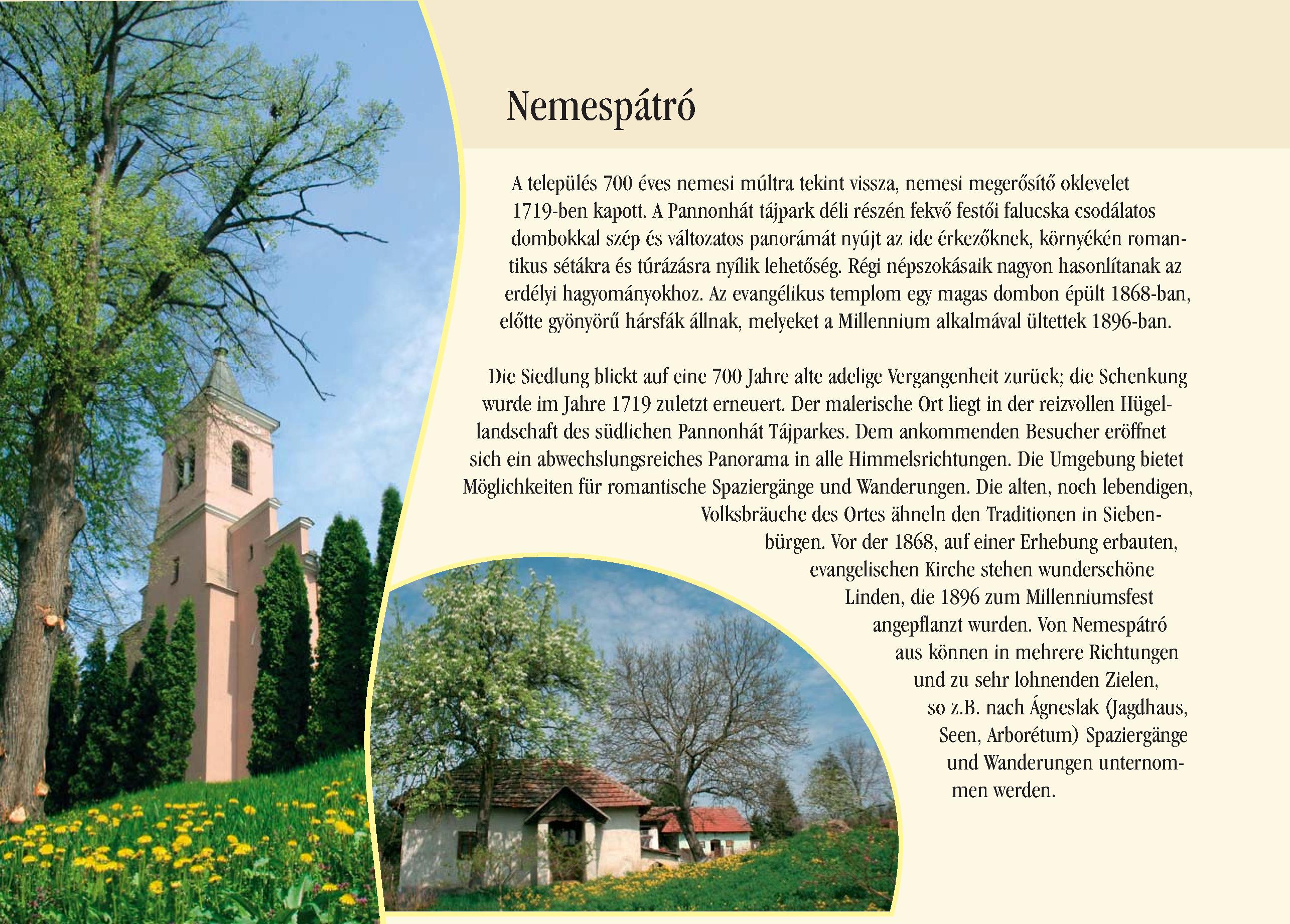 Nyilvános 2192 | 8779 | Nemespátró | Die Siedlung blickt auf eine 700 Jahre alte adelige Vergangenheit zurück; die Schenkung wurde im Jahre 1719 zuletzt erneuert. Der malerische Ort liegt in der reizvollen Hügel-landschaft des südlichen Pannonhát Tájparkes. Dem ankommenden Besucher eröffnet sich ein abwechslungsreiches Panorama in alle Himmelsrichtungen. Die Umgebung bietet Möglichkeiten für romantische Spaziergänge und Wanderungen. Die alten, noch lebendigen, Volksbräuche des Ortes ähneln den Traditionen in Siebenbürgen. Vor der 1868, auf einer Erhebung erbauten, evangelischen Kirche stehen wunderschöne Linden, die 1896 zum Millenniumsfest angepflanzt wurden. Von Nemespátró aus können in mehrere Richtungen und zu sehr lohnenden Zielen, so z.B. nach Ágneslak (Jagdhaus, Seen, Arborétum) Spaziergänge und Wanderungen unternommen werden. Dieses Text stammt von: Pannonhát tájpark prospektus 2006. Web: http://www.pannonhat.hu/ (auch in Deutsch) |