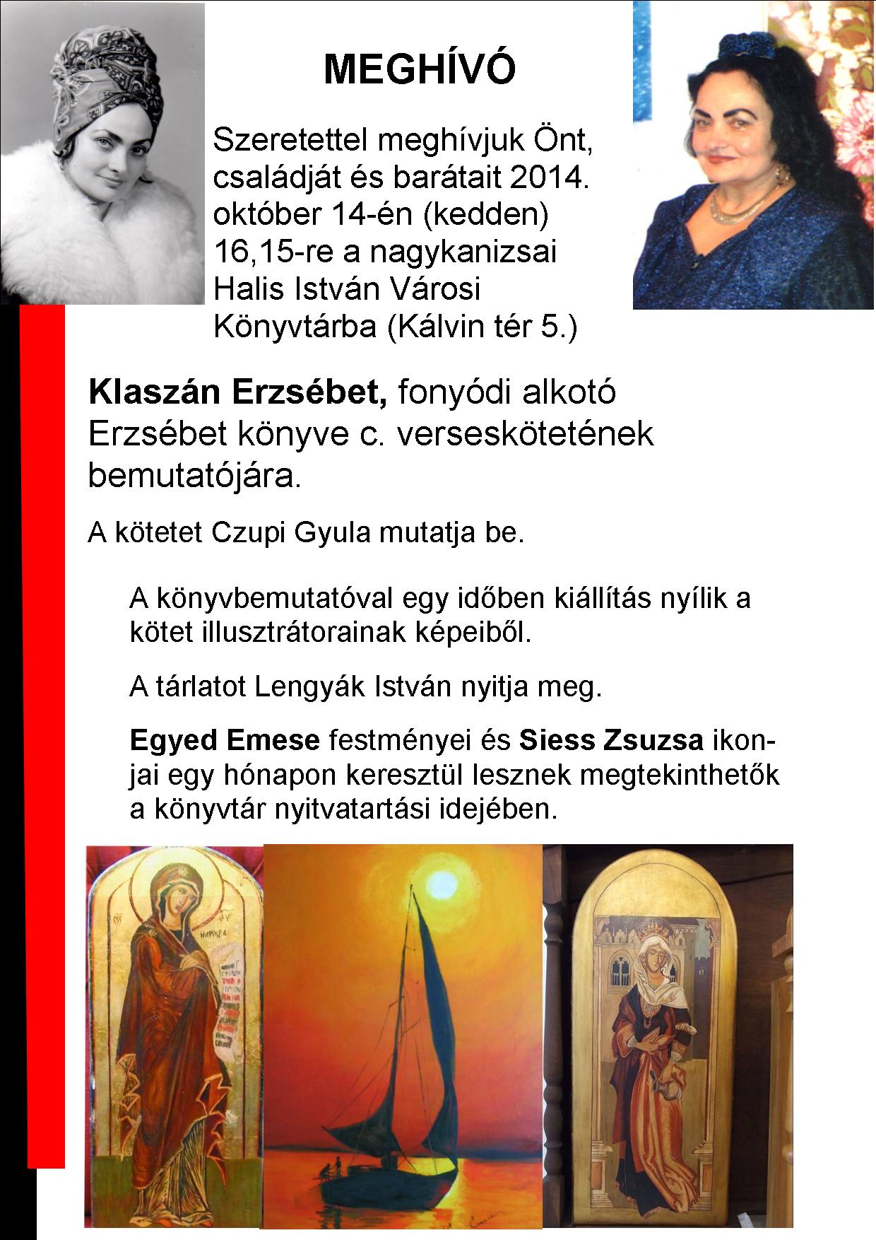 Nyilvános 1209 | 1865 | MEGHÍVÓ | Szeretettel meghívjuk Önt, családját és barátait 2014. október 14-én (kedden) 16,15-re a nagykanizsai Halis István Városi Könyvtárba (Kálvin tér 5.) Klaszán Erzsébet, fonyódi alkotó Erzsébet könyve c. verseskötetének bemutatójára. A kötetet Czupi Gyula mutatja be. A könyvbemutatóval egy időben kiállítás nyílik a kötet illusztrátorainak képeiből. A tárlatot Lengyák István nyitja meg. Egyed Emese festményei és Siess Zsuzsa ikonjai egy hónapon keresztül lesznek megtekinthetők a könyvtár nyitvatartási idejében. |