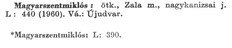 Nyilvános 2440 | 6463 | A szócikkek felismertetett szövege: | (A csillag után az 1972-es kiadású kiegészítő kötetből származó szöveg következik) Magyarszentmiklós: ötk., Zala m., nagykanizsai j. L : 440 (1960). Vá.: Újudvar. *Magyarszentmiklós: L: 390. A szócikkek a következő lexikonból származnak: Cím: Új magyar lexikon Közreműködő: Berei Andor (1900-1979) (szerk.) Szerz. közl.: [szerk. Berei Andor et al.] Kiadás jelzés: 2. lny. Kiadás: Budapest : Akad. K., 1961-1962 Kötetei: 1., A - C 2., D - F 3., G - J 4., K - Me 5., Mf - R 6., S - Z 7. köt., A-Z Kiegészítő kötet (1972) Kiegészítő kötet, 1962÷1980 (1981) ETO jelzet: 03=945.11 Szakjelzet: 030 Cutter: U 28 Nyelv: magyar Megjegyzés: Bibliogr. a címszavak egy részének végén |
