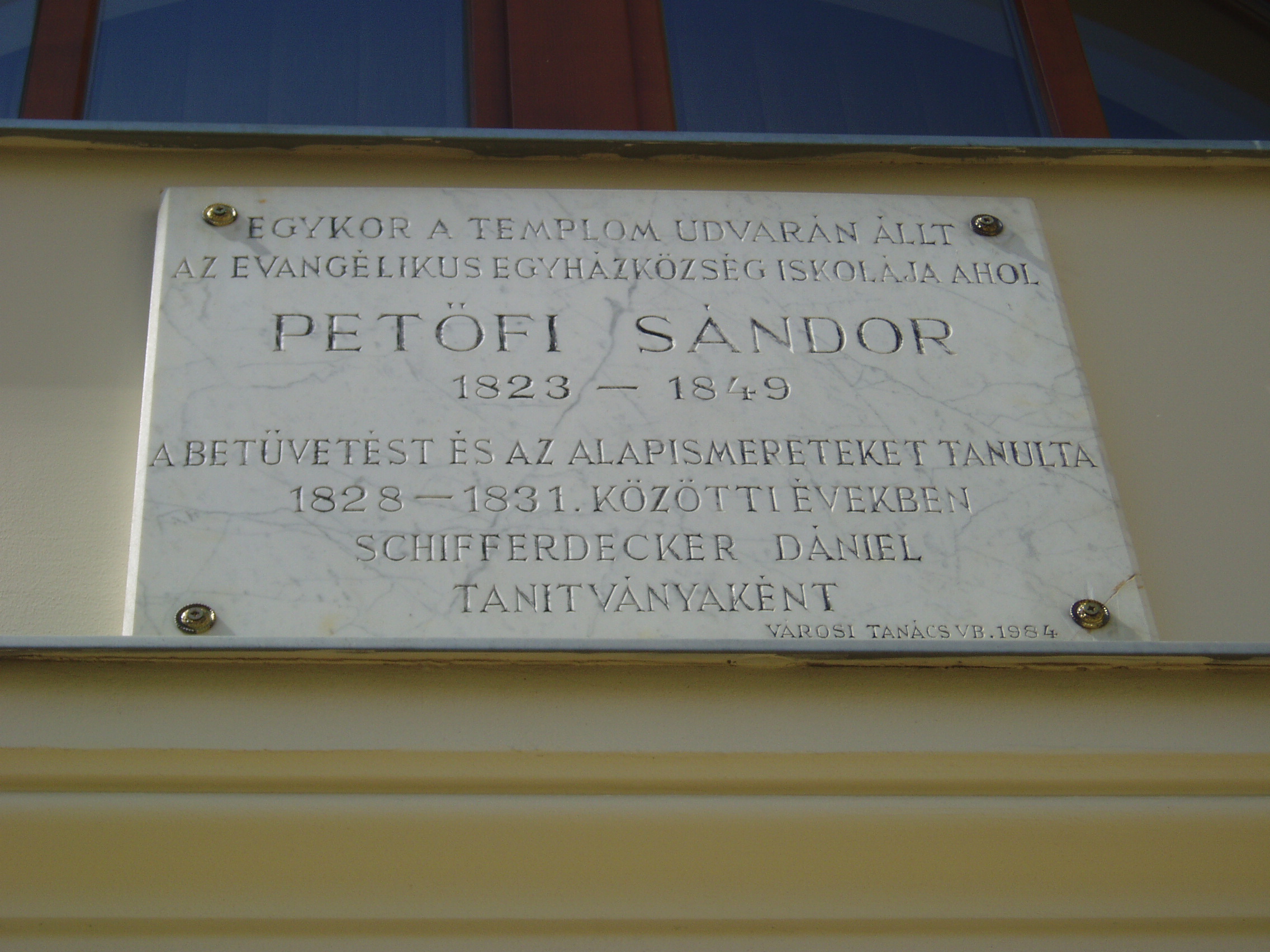 Nyilvános 1305 | 2448 | Kecskemét, Arany János utca 1. | Az Ybl Miklós által tervezett evangélikus templom mellett áll az Evangélikus Egyház Lelkészi Hivatalának épülete. Rajta márványtábla idézi Petőfi Sándor emlékét, aki itt, az egykor ezen a helyen állott elemi iskolában tanult kisiskolás korában. Egy másik, ugyanerre vonatkozó emléktáblát a közelben álló Szabadság tér 3. számú épületen is elhelyeztek. A fénykép 2006 augusztusában készült. Felh. irod.: Heltai Nándor: Kecskemét. Kecskeméti Lapok, 1998 |