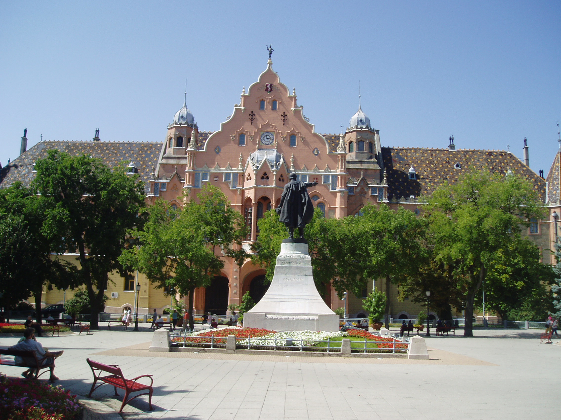Nyilvános 1167 | 2003 | Kecskemét, Kossuth tér 1. | A szecessziós stílusú városháza 1892-1896 között épült Lechner Ödön és Pártos Gyula tervei szerint. A külső majolikadíszek a Zsolnay-gyárban készültek. Pompázatos közgyűlési termében Székely Bertalan freskói láthatók. A fénykép 2006 augusztusában készült. Felh. irod.: Heltai Nándor: Kecskemét. Kecskeméti Lapok, 1998 |