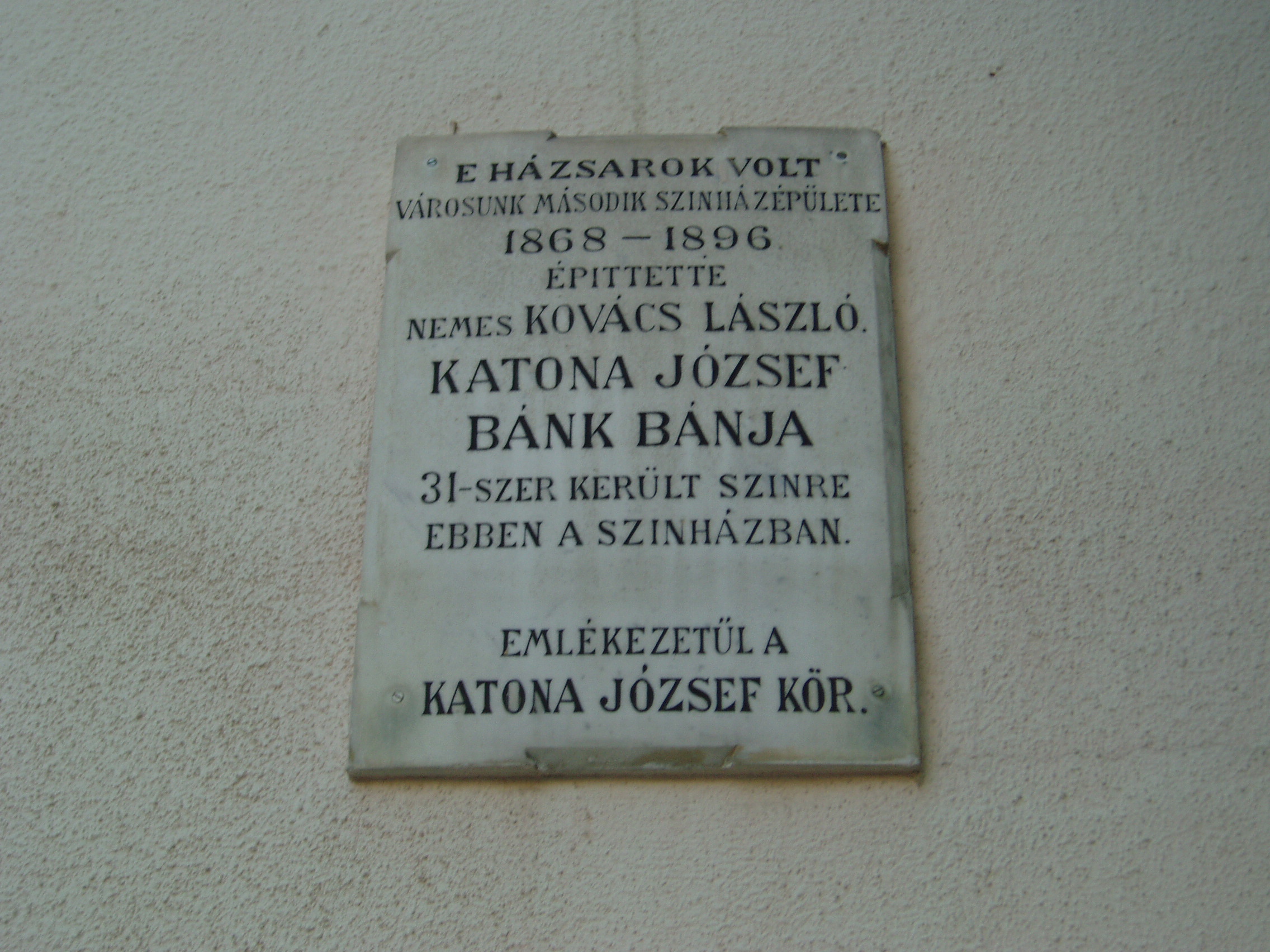 Nyilvános 1136 | 1649 | Kecskemét, Katona József tér 3. | Az épület homlokzatán olvasható emléktábla szerint 1868 és 1896 között itt - egész pontosan kicsit odébb, a Katona József tér és a Batthyány utca sarkán - állt Kecskemét második állandó színházépülete. Kecskemét első állandó színháza, amely egykor a mai művelődési központ mögött állott, kezdettől fogva nehezen felelt meg a kívánalmaknak. Egy helybeli polgár, Kovács László 1862-ben ajánlatot tett a városnak új színház építésére. Miután évekig hiába várakozott kedvező válaszra, 1868-ra saját erejéből és a maga elgondolása alapján mégis megépítette a színházat háza magas, nagy pincéje fölé, a Nádor vendéglővel egy telken. 1868. december 26-án Katona József Bánk bánjával avatták fel. Az épület 1896-ig állott a színjátszás szolgálatában, ekkor nyílt meg — e játszóhely szomszédságában — Kecskemét első méltó színházépülete, a mai Katona József Színház (lásd: Kecskemét, Katona József tér 5.). A fénykép 2006 augusztusában készült. Felh. irod.: Bács-Kiskun megyei történeti és kegyeleti emlékhelyek számbavétele. Kecskemét, 1989 Joós Ferenc: A vándorszínészettől az Állami Színházig. Kecskemét, 1957. /Kiskunság Kiskönyvtára 3./ |