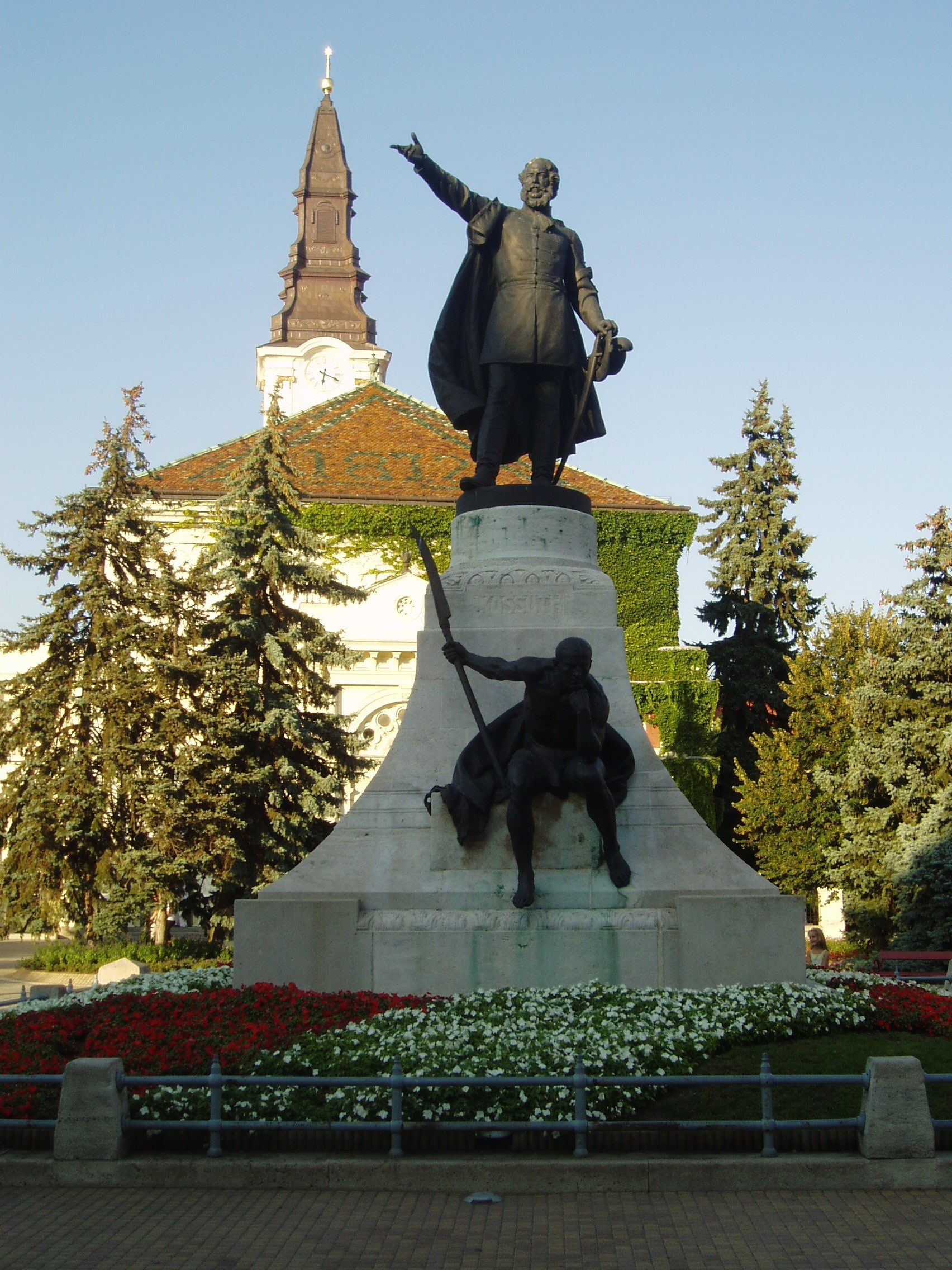 Nyilvános 1487 | 2310 | Kecskemét, Kossuth tér: Kossuth Lajos szobra | Kossuth Lajos 2 és fél méter magas bronzszobrát, Telcs Ede alkotását 1906-ban avatták fel Kecskemét központjában. Az alkotás az 1848/49-es forradalom és szabadságharc emléke mellett Kossuth 1848. szeptember 25-én — ugyanezen a helyen, az akkori régi vásártéren — elmondott toborzó beszédét is felidézi. A szobor ülő mellékalakja kiegyenesített kaszát tart a kezében. E mellékalakról maga a szobrász mondta, hogy ugyan Rodin: Gondolkodó című híres szobrához nagyon hasonló pózban ül, de megfeszített izmokkal, készen rá, hogy ha Kossuth „mégegyszer azt üzeni”, a kezében tartott kiegyenesített kaszával rögtön rámenjen az osztrákra. A helyi hagyomány szerint e mellékalak modellje Kacsóh Pongrác, a János vitéz alapján írt daljáték zeneszerzője volt. A fénykép 2006 augusztusában készült. Felh. irod.: Heltai Nándor: Kecskemét. Kecskeméti Lapok, 1998 Orosz Andrea: Kiskunság és Felső-Bácska. Bp. Frigoria, 2004 |