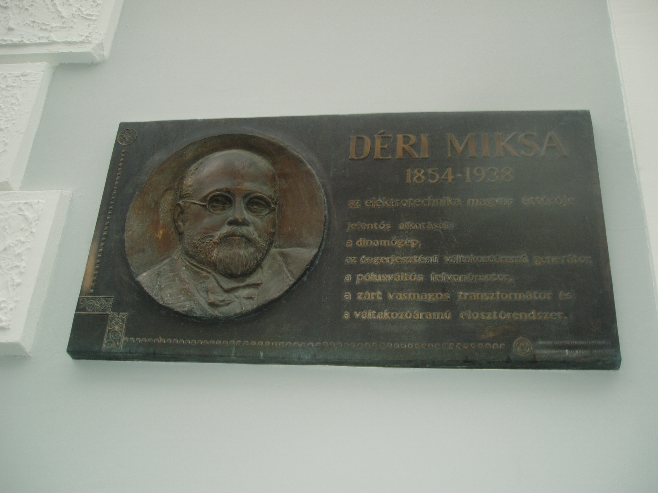 Nyilvános 1171 | 1984 | Baja, Déri Miksa köz: Déri Miksa emléktáblája | A róla elnevezett kis belvárosi közre néző épület falán elhelyezték a névadó emléktábláját. Déri Miksa (1854-1938) a korszerű elektrotechnika elméleti és gyakorlati megalapozója, a transzformátor egyik felfedezője volt. Az egykori Bács-Bodrog megye déli részén fekvő Bács községben született gazdag kereskedőcsalád sarjaként. Testvére volt Déri Frigyes (lásd: Baja, Déri kert) és Déri Kálmán festőművész. A bajai cisztercita gimnáziumba (lásd: Baja, Szent Imre tér 5.) járt, műszaki tanulmányait a budapesti József Műegyetem mérnöki szakosztályán kezdte el, vízépítő-mérnöki oklevelet 1877-ben szerzett a Bécsi Műegyetemen. Először folyamszabályozási munkákban vett részt a fővárosban és Szegeden, de már ekkor foglalkoztatta a villamosság. Zipernowsky Károly - akivel még az első elektrotechnikai próbálkozások idején ismeretséget kötött - 1882-ben munkatársul fogadta és Déri belépett a Ganz gyár Elektromos Osztályára. Közös munkájuk első eredménye az öngerjesztésű váltakozó áramú generátor volt. Déri 1883-tól kezdve Bécsben dolgozott a gyár ausztriai képviselőjeként, de a kutatói munkát Zipernowskyval továbbra is rendszeresen folytatták. Kiváló munkatársat kaptak Bláthy Ottó személyében, aki szintén a Ganznál dolgozott gépszerkesztőként. Nagyrészt a három feltalálónak köszönhetően a Ganz gyár néhány éven belül tekintélyes, nemzetközi jelentőségű vállalattá fejlődött. Bláthy ötletére 1885-ben megalkották a zárt vasmagú transzformátort, amelynek megalkotásában Déri a kísérleti munka oroszlánrészét végezte. Szabadalmukat Zipernowsky-Déri-Bláthy (ZBD) transzformátor néven ismerte meg a világ. 1889-től Déri az akkor alapított bécsi Internationale Électricitäts Gesellschaft vezető igazgatója lett, még ebben az évben megszervezte és berendezte a bécsi villamos-erőművet. Bécs város villamos világításának koncesszióját a bécsi Union Bank és a Ganz-gyár nyerték el, e két vállalat alapította az I.E.G. vállalatot, amelynek Déri 1896-ig volt igazgatója. A vállalat az első olyan vállalkozás volt Európában, amely kizárólag villamos erőművek létesítésének pénzügyi szolgáltatása céljából alakult meg. Néhány év alatt 60 Monarchia-beli transzformátor telep kiépítésében vett részt. Déri Miksa számos egyéni, valamint Zipernowskyval és Bláthyval közösen kifejlesztett találmányt is magáénak mondhat. 1898 és 1902 között kidolgozta kompenzált egyenáramú gépét, majd 1903-1904-ben kifejlesztette a kétkefe-rendszerű egyfázisú repulziós motorát, amelyet a világirodalom Déri-motor néven ismer. 1938. március 5-én hunyt el 84 éves korában Merano-ban, ahol nyugalomba vonulva élt. A fénykép 2007 októberében készült. Felh. irod.: www.industrianet.hu/UserFiles/ehsz/Deri_Miksa.htm |