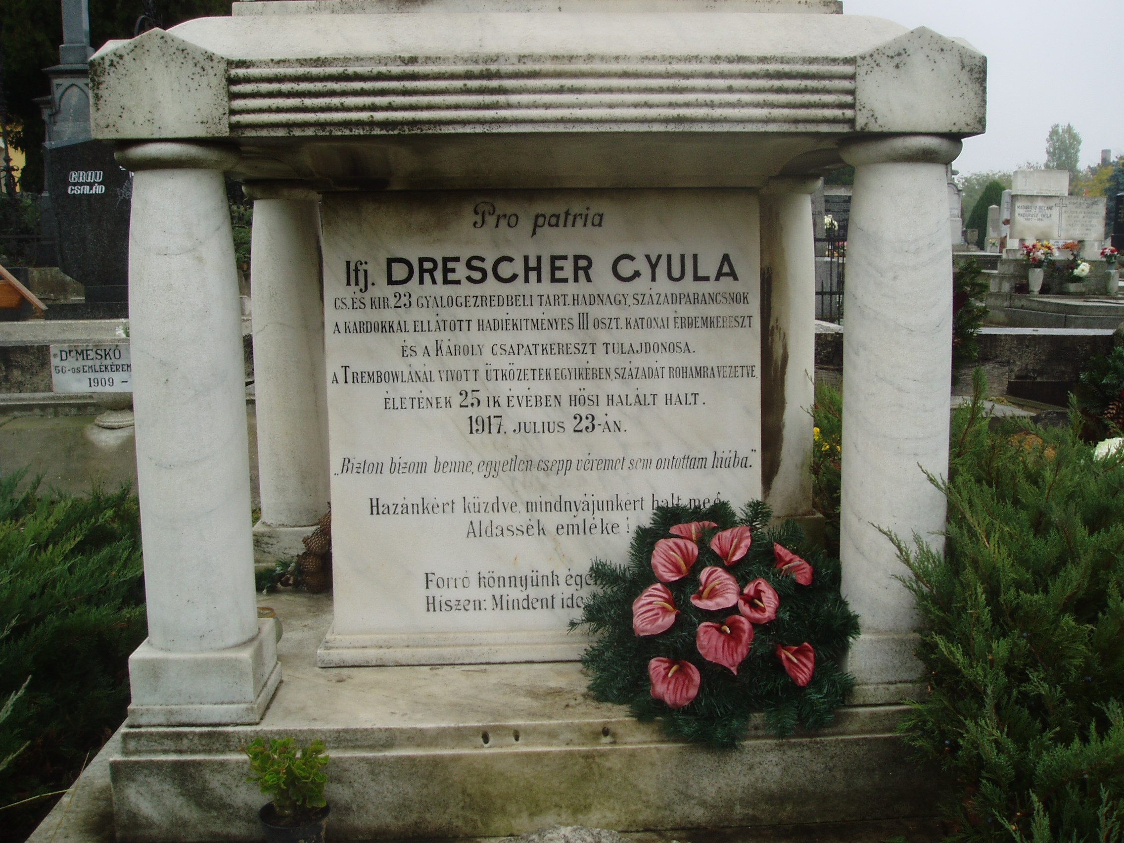 Nyilvános 1110 | 2163 | Baja, Rókus utva: Rókus temető - Drescher Gyula sírja | Itt nyugszik ifj. Drescher Gyula, a 23. gyalogezred tartalékos hadnagya, századparancsnok. Hősi halált halt életének 25. évében, 1917. november 23-án. A fénykép 2007 októberében készült. |