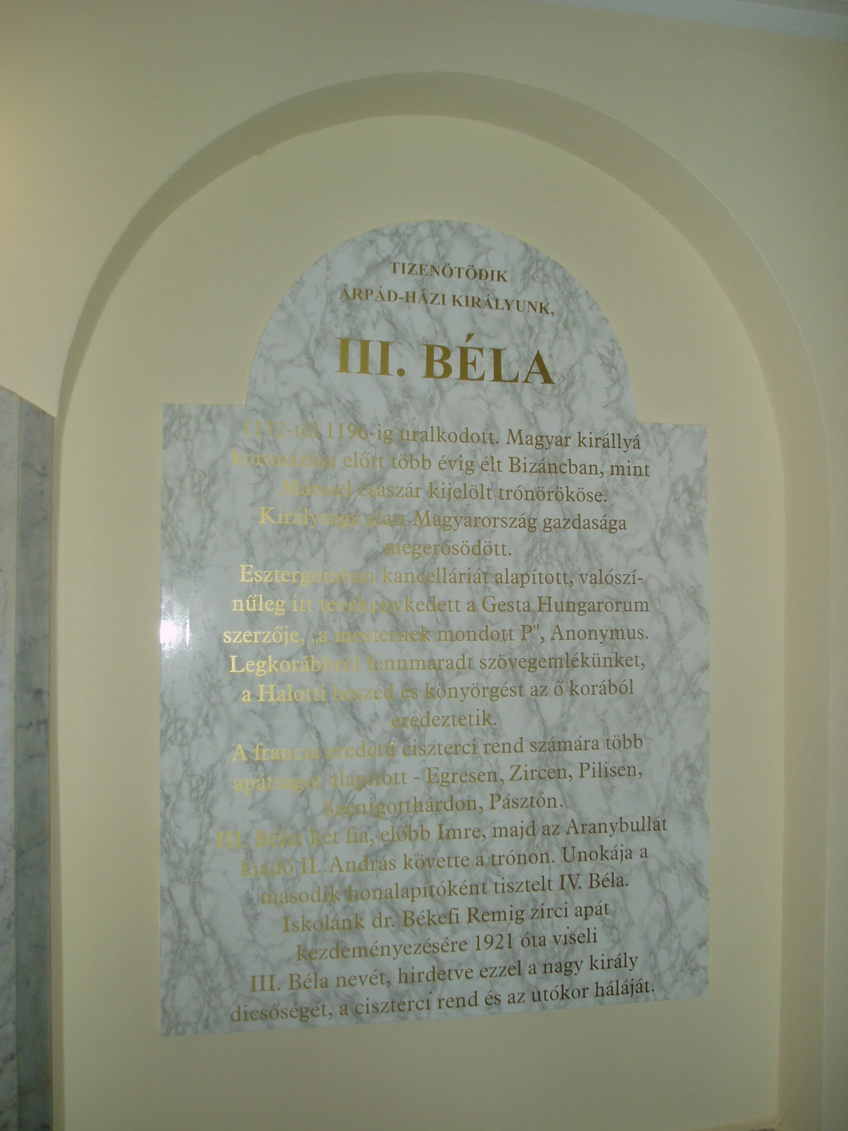 Nyilvános 1078 | 1544 | Baja, Szent Imre tér 5. III. Béla Gimnázium: III. Béla emléktáblája az iskola előcsarnokában | Az 1757-ben alapított iskola mai épületét 1815-ben emelték, majd 1892-ben és 1931-ben jelentősen bővítették, alakították. Korábban a közelben ma is álló ferences kolostorban (lásd: Baja, Bartók B. u. 1-3.) folyt a tanítás. Az intézmény a ferencesek után 1879-től a ciszterci rendé lett. III. Béla nevét, aki a ciszter rendet letelepítette Magyarországon, az 1921/22-es tanévben vette fel. Ma már szobra is ott áll az épület előtt. 1948 óta állami iskola. Híres növendéke volt Nagy Ignác író (1819–1821), Türr István (1835–1840), Tóth Kálmán költő (1839–1845), Szarvas Gábor nyelvész (1842–1848). Pályakezdőként az 1905/06-os tanévben itt tanított Babits Mihály. Az iskolának a zenei életben nevet szerzett diákjai is voltak. Ide járt gimnáziumba az 1902/03-as tanévtől nyolc éven át a bajai születésű Kun Imre (1892–1977), a legendás hangversenyrendező és az 1940-es évek elején a szintén Baján született Lukin László (1926–2004) zenepedagógus, karnagy. A fénykép 2007 októberében készült. Felh. irod.: Bálint László: A bajai III. Béla Gimnázium. Bp. Tankönyvkiadó, 1989 |