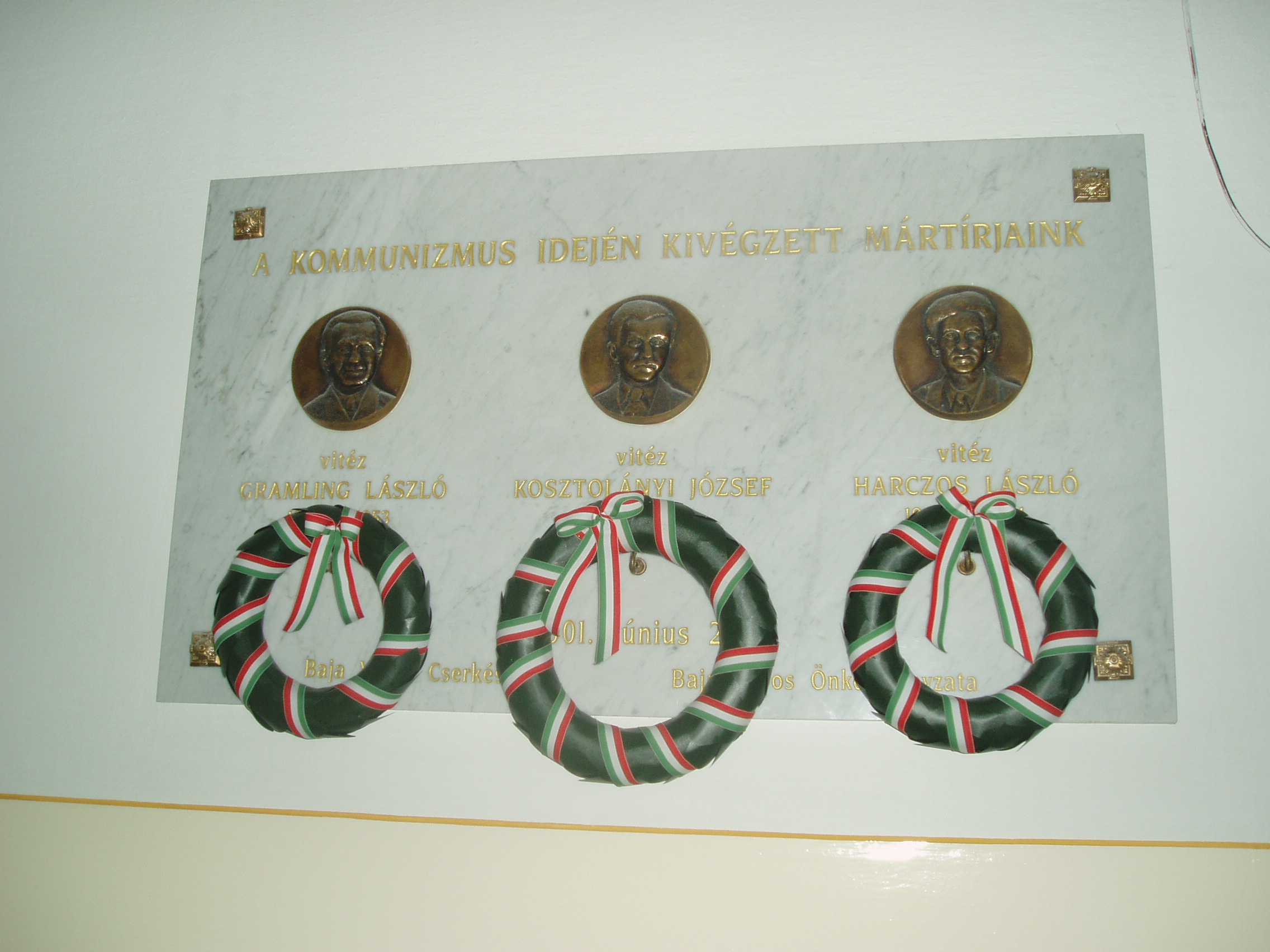 Nyilvános 1085 | 1637 | Baja, Szent Imre tér 5. III. Béla Gimnázium | Vitéz Gramling László, vitéz Kosztolányi József és vitéz Harczos László emléktáblája az előcsarnok falán, akik a koncepciós perek áldozatául estek. Egykor mindhárman a gimnázium cserkészcsapatának tagjai voltak. A fénykép 2007 októberében készült. www.bajatv.hu |
