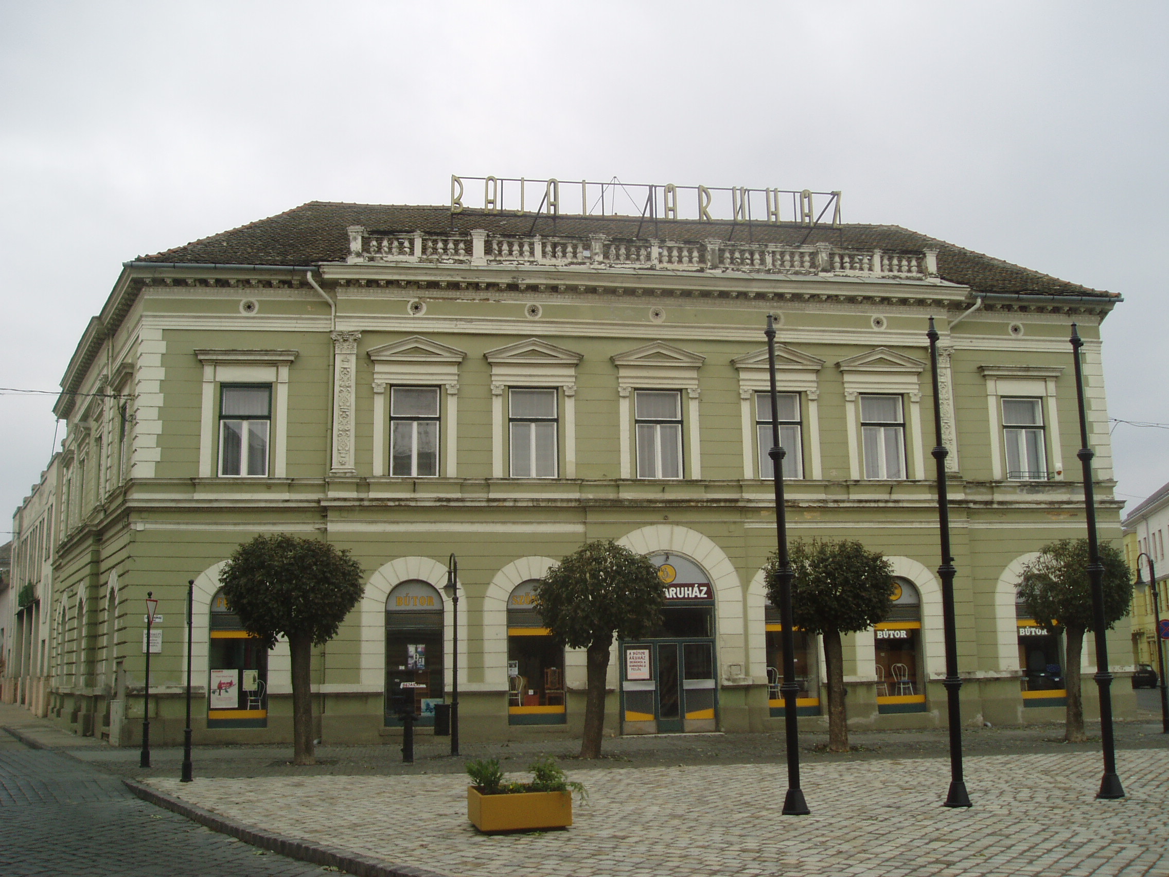 Nyilvános 1118 | 1814 | Baja, Szentháromság tér 3. | A bajai Szentháromság teret magyarországi Szent Márk térként emlegetik. Értékét nemcsak épületei, hanem kövezete is adja. A teret, amely három oldalról beépített, s nyitott negyedik oldala a Sugovicára néz, lóhere formában keresztezik az utak. A teret városképi jelentőségű épületek veszik körül, ezek egyike a 3. számú, 1880 körül eklektikus stílusban épült városi palota. Itt működött egykor a Reich Farkas és Fiai cég áruháza. A fénykép 2007 októberében készült. Felh. irod.: Látnivalók Bács-Kiskun megyében. Miskolc, Well-PRess, 2002 Magyarország műemlékjegyzéke: Bács-Kiskun megye. Bp. Kulturális Örökségvédelmi Hivatal, 2006 |