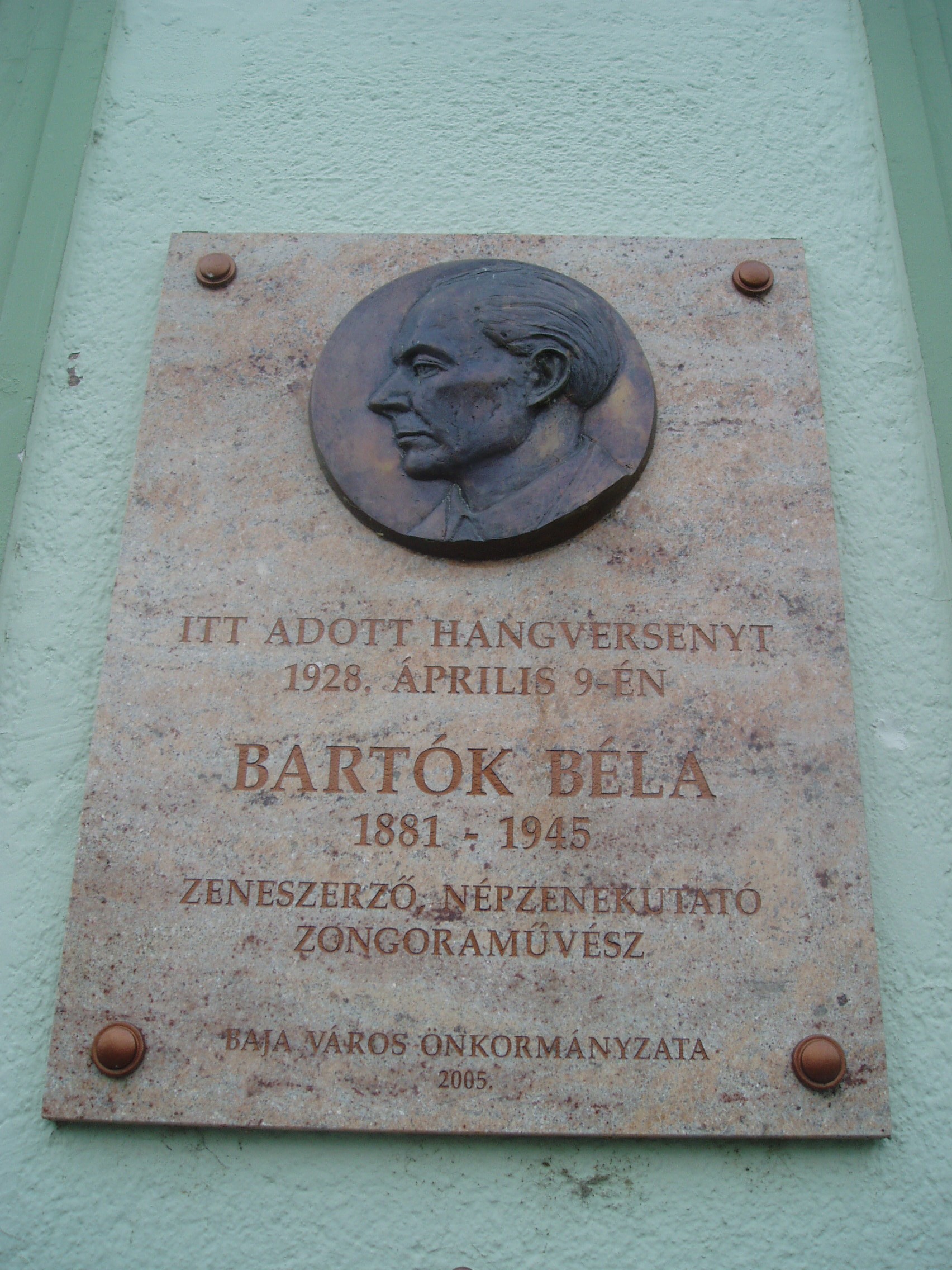 Nyilvános 955 | 1546 | Baja, Szentháromság tér 6. Duna Hotel | A magyar Szent Márk térnek is nevezett Szentháromság tér Sugovica felőli oldalán áll az 1860-as években épített szálloda. Alapításakor Nemzeti Szállónak hívták. Kezdettől fogva Baja nevezetessége, a „boldog békeidők” gazdag Bácskájának találkozóhelye volt, messze idegenből is érkeztek vendégei. Az 1950-ben államosított, és akkoriban Béke szállónak nevezett épülethez abban az időben építészetileg oda nem illő részeket is toldottak, megváltoztatva az épülettest külső tagolását is, leegyszerűsítve épületplasztikáját. Duna szállodának 1960-ban nevezték el. A főépülethez derékszögben csatlakozó, eredetileg földszintes épületszárnyban volt a szálloda díszterme, ahol mulatságokat, színházi előadásokat, műsorokat és hangversenyeket tartottak. Az azóta sajnos lebontott nagyteremben (helyén ma különterem és konyha van) a bajai Liszt Ferenc Kör meghívására fellépett többek között Basilides Mária, Dohnányi Ernő és Hubay Jenő. Amint a homlokzaton elhelyezett emléktáblán is olvasható, 1928. április 9-én, Húsvét hétfőn Bartók Béla adott a teremben szólóestet. A fénykép 2007 októberében készült. Felh. irod.: Látnivalók Bács-Kiskun megyében. Miskolc, Well-PRess, 2002 www.hotelduna.hu Gál Zoltán: Bartók bajai hangversenye. = www.bacskaisport.hu |
