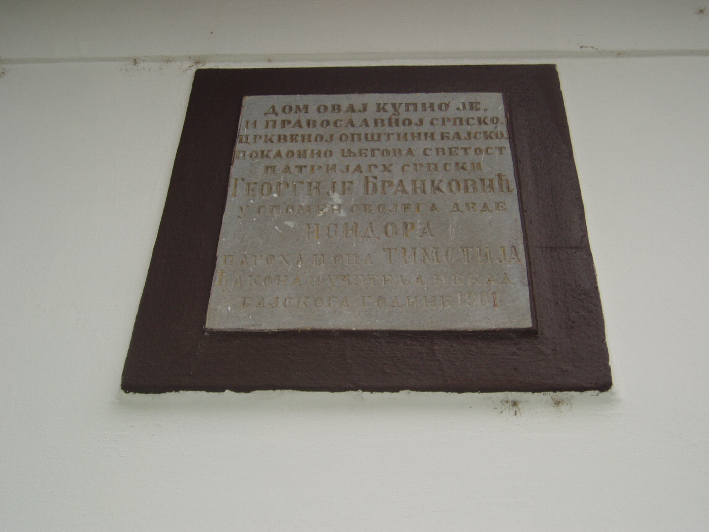 Nyilvános 1121 | 1524 | Baja, Táncsics utca 19. | A görögkeleti szerb paplak homlokzatán olvasható emléktábla szövege magyarul a következő: "Ezt a házat Georgije Brankovity szerb pariarcha vette meg és a bajai Görögkeleti Szerb Egyházközségnek adományozta nagyapja, Izidor Paro és apja, Thimotci diakónus és valamikori bajai tanár emlékére 1901-ben." A fénykép 2007 októberében készült. Felh. irod.: Történelmi és kegyeleti emlékhelyek. = www.kjmk.hu/emlek |