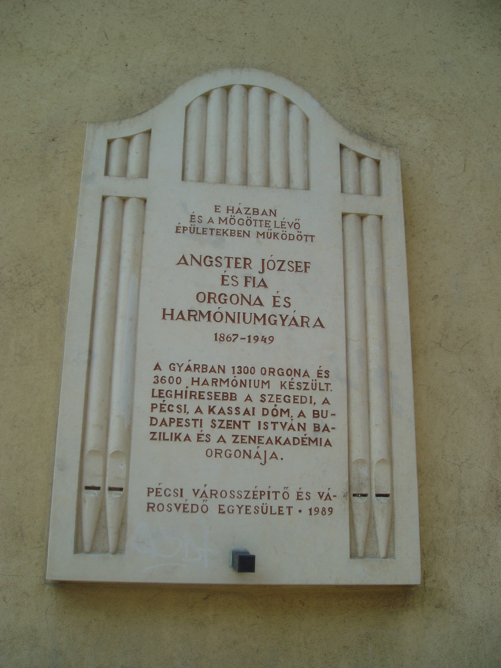 Nyilvános 1112 | 1773 | Pécs, Mária utca 35. | Fénykorában itt, és a környező épületekben működött az Angster orgonagyár. Alapítója, Angster József (1834–1918) nem született bele a szakmába. Eszéki asztalos–tanoncként töltött évek után Bécsben tanulta a hangszerkészítő szakmát. Tudását Párizsban tökéletesítette a világhírű Cavaillé–Coll orgonagyárban, ahonnét az akkor elérhető legmagasabb képzettséggel érkezett haza. Saját gyárának megalapítása után az első kimagasló szakmai sikert a kalocsai székesegyház (lásd: Kalocsa, Szentháromság tér) számára megépített orgonája hozta meg számára. Az orgonaüzem többször költözött, mert a megrendelések szaporodása miatt egyre nagyobb helyre lett szüksége. A József utcába való költözés jelentette a végleges telephely kialakításának első lépését. A gyártelepet 1891-ben tovább bővítették a József utcával párhuzamos Mária utcában levő 35. számú épülettel; ezen a házon látható az 1989-ben felavatott emléktábla. A századfordulón a kitűnő Angster–orgonák már szinte benépesítették a Kárpát–medencét, sőt eljutottak az akkori határokon túlra is. A fejlődés kiemelkedő lépcsőfoka volt a pécsi Belvárosi plébániatemplom (lásd: Pécs, Széchenyi tér) orgonájának ünnepélyes felavatása 1886-ban. Közben Angster József fiai, Emil és Oszkár is bekapcsolódtak a munkába, és apjuk 1918-ban ebben a házban bekövetkezett halála után ők vezették a céget. olyan hangszerek születtek, mint a budapesti Zeneakadémia orgonája 1925-ben és a szegedi Fogadalmi templom hatalmas hangszere. 1940-ben a harmadik Angster–generáció vette át a vezetést: Angster József és Imre. Az ő háborús idejükben is megtartotta hírét az üzem, de 1949. december 28-án bekövetkezett az államosítás, a fokozatos megszüntetés, a vezetők meghurcolása és a berendezések kiselejtezése. Napjainkban az Angster–hagyomány a tudomány síkján a stuttgarti Fraunhofer tudományos intézetben Angster Judit és férje, Miklós András révén, a gyakorlatban pedig az 1992 óta működő Pécsi Orgonaépítő Manufaktúra (Pécs, Buzsáki utca 37.) munkájában folytatódik. A fénykép 2006 júliusában készült. Felh. irod.: Angster József: Az Angster-család és az Angster Orgonagyár történetéből. = Angstertől Zsolnayig. Ipartörténeti tanulmányok. Pécs, 1999 |
