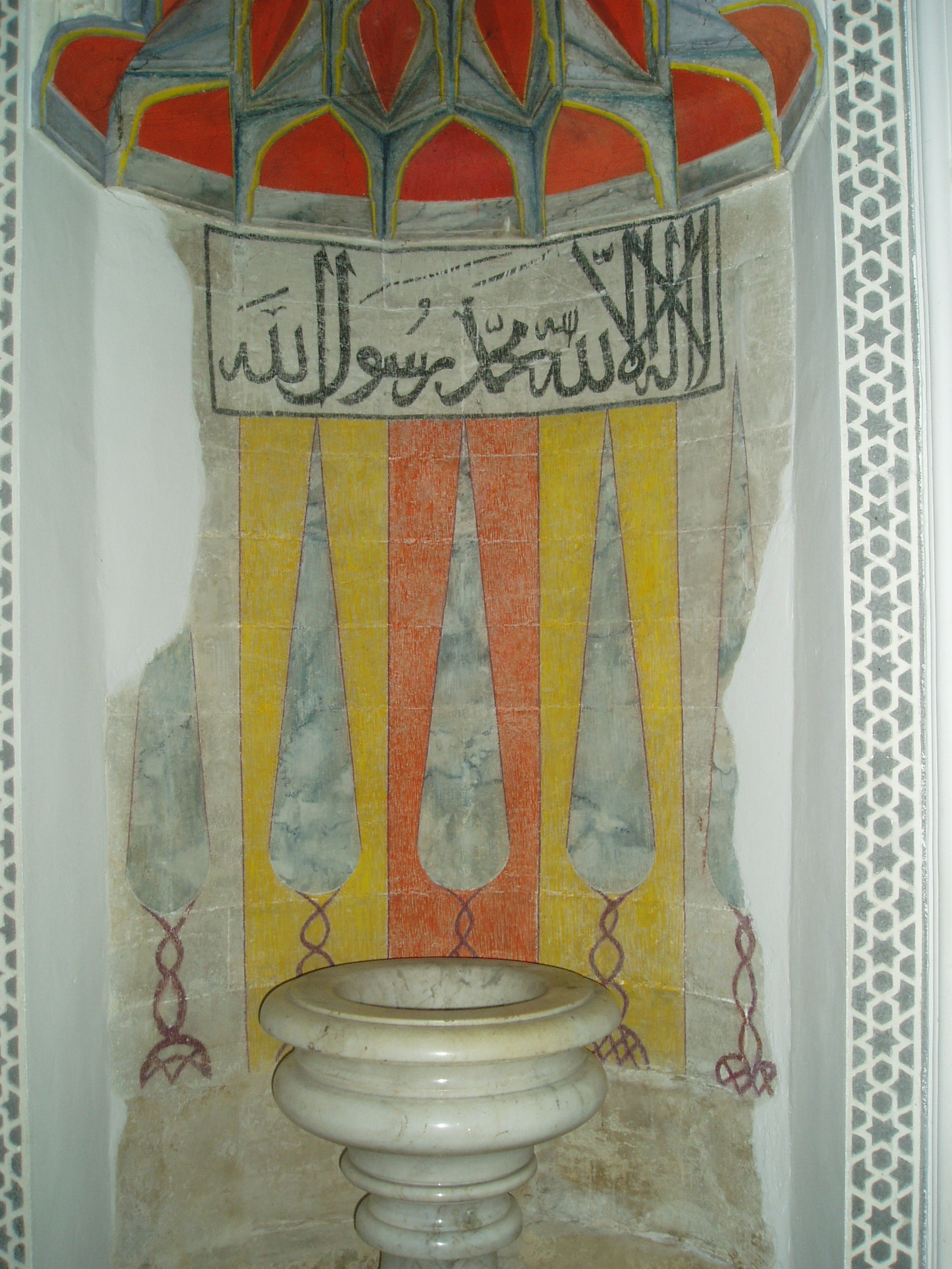 Nyilvános 1134 | 1733 | Pécs, Széchenyi tér: Dzsámi, ma Belvárosi templom | Az egykori Szent Bertalan-templom helyén épült fel a török dzsámi 1543-46 között. Építtetője Gázi Kászim, a később budai pasa volt. A török kiűzése után az épületet a jezsuiták kapták meg, a minaretet lebontották, az épületet átalakították, de az ma is őrzi az iszlám jegyeit. A dzsámi imafülkéje (mihrábja) a délkeleti fal tengelyében látható, festése rekonstrukció. Ettől balra és jobbra Allah és Mohamed nevének felirata figyelhető meg. Sztalaktit boltozata, szamárhátíves ablakai a mai keresztény templom hangulatában érdekesen idézik fel a török építészet sajátosságait. Szenteltvíztartói török mosdómedencék voltak. A fénykép 2006 júliusában készült. Felh. irod.: Csorba csaba: Pécs. Bp. Panoráma, 1983 www.vendegvaro.hu |