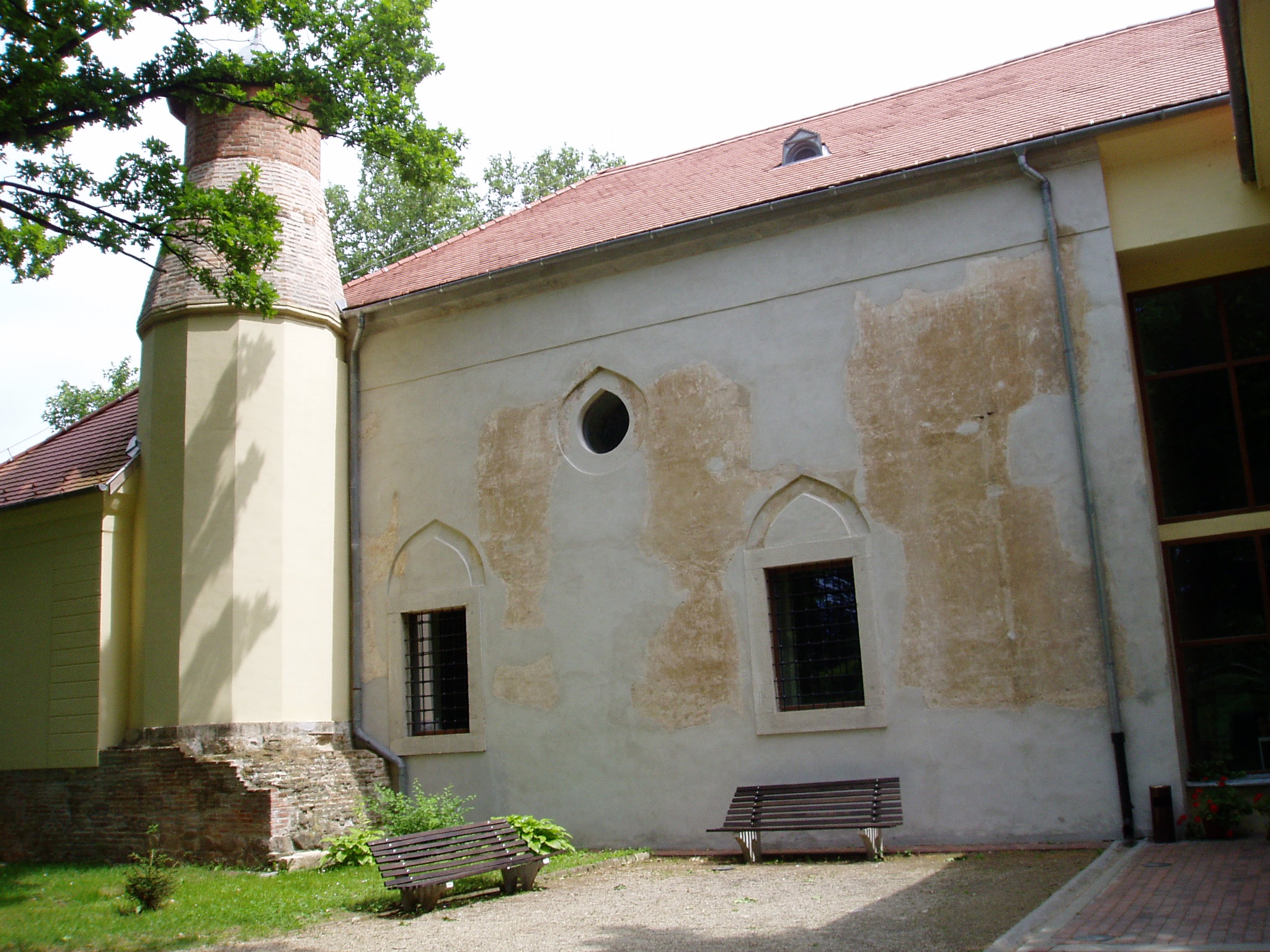 Nyilvános 1726 | 3260 | Szigetvár, Vár: dzsámi | A vár egyik központi épülete a Szulejmán dzsámi, amely a győztes szultán tiszteletére épült a XVI. században. A téglalap alaprajzú dzsámi Mekka felé néző oldalán látható a kőkeretes, egykor csempével borított, szalaktit boltozatú imafülke (mihrab). A dzsámit L alakú folyosó veszi körül, ennek délkeleti oldalán egy másik mihrab fülke található. Északnyugaton csatlakozik a dzsámihoz a szabályos tizennégyszög alakú minaret, amelynek nagy része a XVIII. században leomlott. A fénykép 2005 júniusában készült. Felh. irod.: Török műemlékek Magyarországon. = www.terebess.hu/keletkultinfo/minaret/szigetvar.html |