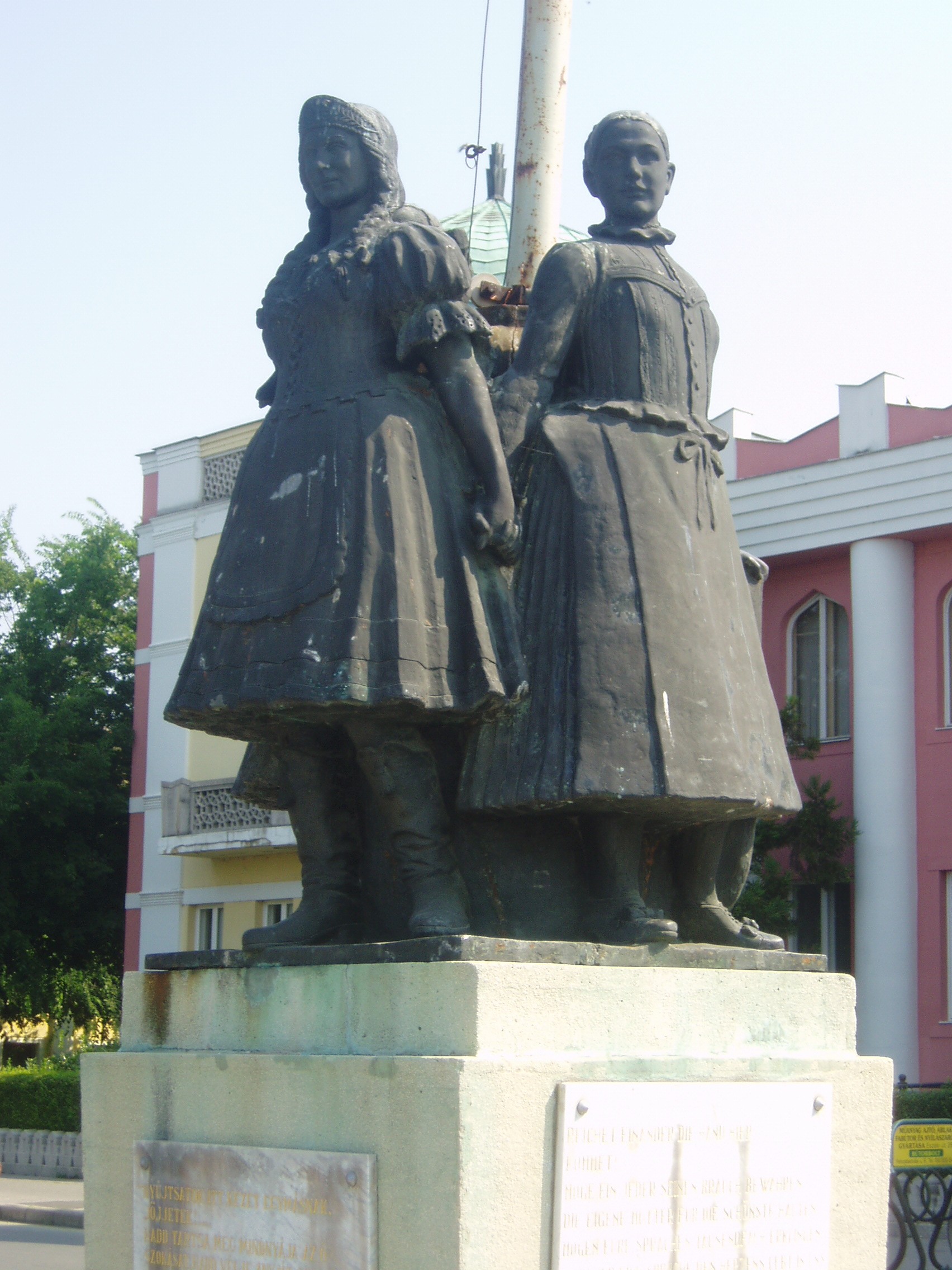 Nyilvános 1810 | 3667 | Mohács, Széchenyi tér | A Széchenyi tér a város fő tere, középpontjában emelkedik a Fogadalmi templom, keleti oldalán pedig az 1926-ban, a mohácsi csata 400. évfordulója alkalmából Árkay Aladár tervei szerint épített városháza. A városháza előtt 1932-ben állították fel Martinelli Jenő harmonikus szoborkompozícióját: a sokác, magyar és német népviseletbe öltözött lányok szoboralakja a nemzetiségek békés egymás mellett élése szimbólumaként fogja egymás kezét. A szobor talapzatán a nagy német drámaíró és költő, G. E. Lessing versrészlete olvasható: „Nyújtsatok itt kezet egymásnak, jöjjetek! Hadd tartsa meg mindnyája az ő szokását, Hadd vélje anyját szebbnek mindenkinél. Hadd járjon azután a nyelvetek ezer felé. A szívnek csakis egy nyelve van közöttünk!” A fénykép 2006 júliusában készült. Felh. irod.: Látnivalók Pécsett és Baranyában. Miskolc, Well-PRess, 1998 www.mohacs.hu www.vendegvaro.hu |
