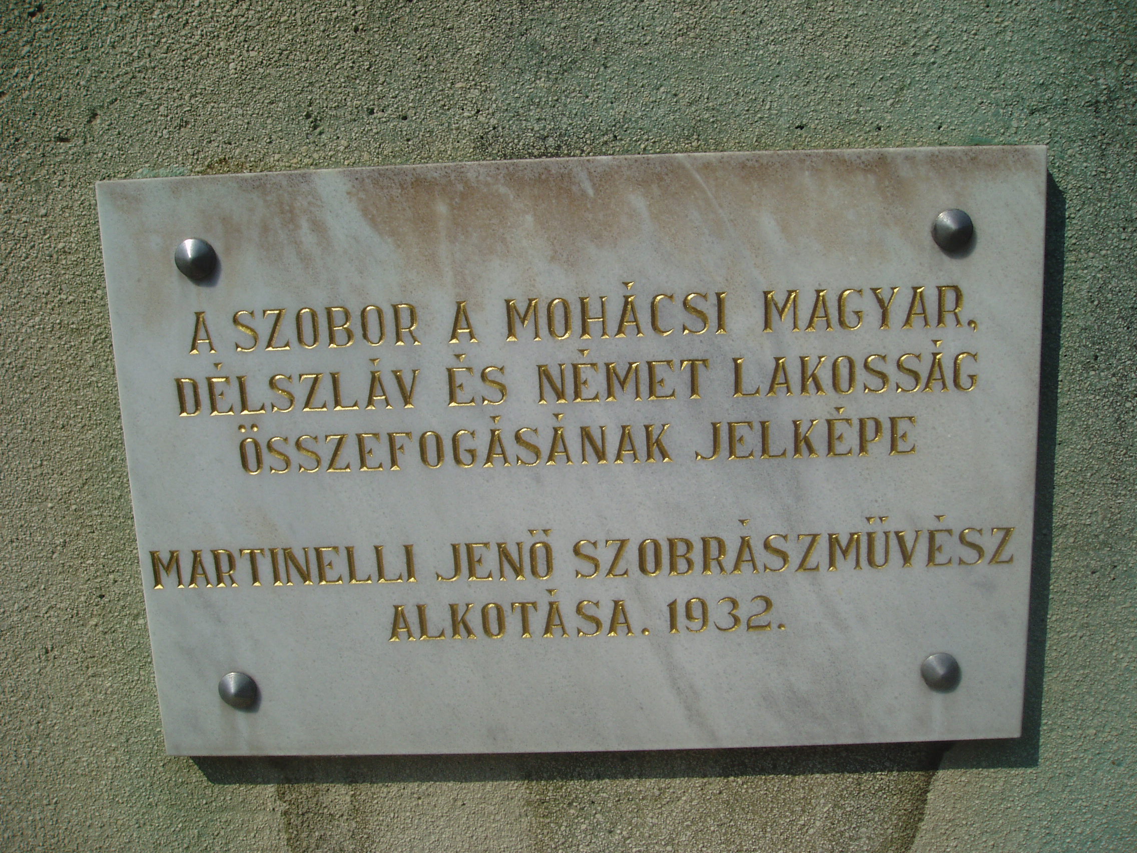 Nyilvános 1601 | 3635 | Mohács, Széchenyi tér | A Széchenyi tér a város fő tere, középpontjában emelkedik a Fogadalmi templom, keleti oldalán pedig az 1926-ban, a mohácsi csata 400. évfordulója alkalmából Árkay Aladár tervei szerint épített városháza. A városháza előtt 1932-ben állították fel Martinelli Jenő harmonikus szoborkompozícióját: a sokác, magyar és német népviseletbe öltözött lányok szoboralakja a nemzetiségek békés egymás mellett élése szimbólumaként fogja egymás kezét. A szobor talapzatán a nagy német drámaíró és költő, G. E. Lessing versrészlete olvasható: „Nyújtsatok itt kezet egymásnak, jöjjetek! Hadd tartsa meg mindnyája az ő szokását, Hadd vélje anyját szebbnek mindenkinél. Hadd járjon azután a nyelvetek ezer felé. A szívnek csakis egy nyelve van közöttünk!” A fénykép 2006 júliusában készült. Felh. irod.: Látnivalók Pécsett és Baranyában. Miskolc, Well-PRess, 1998 www.mohacs.hu www.vendegvaro.hu |