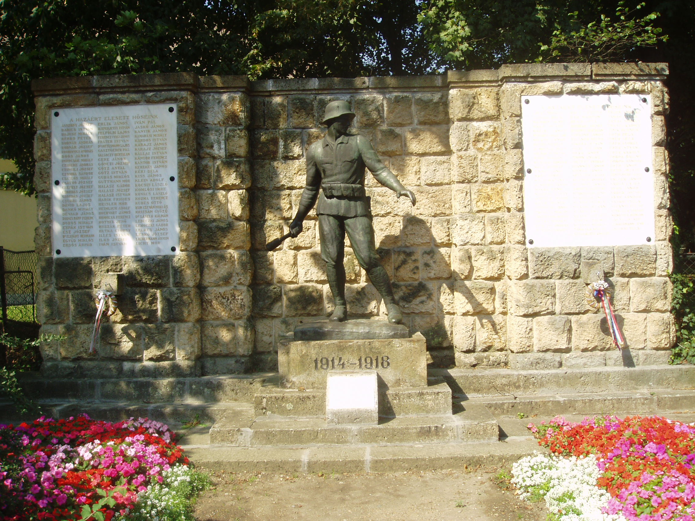 Nyilvános 1457 | 3747 | Sárospatak, Iskolakert bejárat: I. világháborús emlékmű | A Református Kollégium (lásd: Sárospatak, Rákóczi u. 1.) bejáratával szemben találjuk a hét hektáros Iskolakertet. Bejáratát két emlékmű fogja közre. A Táncsics utca felőli oldalon áll az I. világháború hőseinek emlékét idéző, gránátot dobó honvéd bronzszobra. Medgyessy Ferenc alkotását 1935-ben leplezték le. A fénykép 2007 augusztusában készült. Felh. irod.: www.vendegvaro.hu |