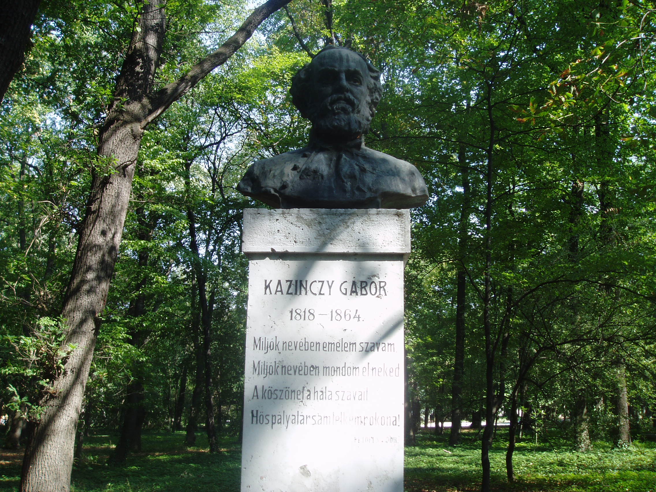 Nyilvános 1124 | 1825 | Sárospatak, Iskolakert: Kazinczy Gábor szobra | A Református Kollégium (lásd: Sárospatak, Rákóczi u. 1.) bejáratával szemben találjuk az Iskolakertnek nevezett parkot. Az 1980-as években természetvédelmi területté nyilvánított Iskolakert sajátos nemzeti érték, mely egyedülálló az országban. Sétányai mentén Patakhoz kötődő jeles személyiségek szobrai állnak. Kazinczy Gábor (1818-1864) bronz mellszobrát, Maugsch Gyula alkotását 1937-ben avatták fel a Kossuth Kollégiumhoz vezető út jobb oldalán. Nagybátyja, Kazinczy Ferenc példáján felbuzdulva már tizenhárom éves korában elhatározta, hogy író lesz. Népbarát című lapja köré egész írókör tömörült. Későbbi életében már a politika játszotta a vezető szerepet: a reformellenzék egyik legnépszerűbb alakja volt. Szónoki tehetsége, melyet Petőfi is magasztalt, kortársai véleménye szerint Kossuthéval vetekedett. A szabadságharc bukása után hazája sorsa felett kétségbeesve a Borsod megyei Bánfalván húzódott meg, és csak 1861-ben lépett újra a nyilvánosság elé élete egyik legnagyobb hatású országgyűlési beszédével, majd reményeiben csalatkozva újra és most már véglegesen eltemetkezett magányába. A fénykép 2007 augusztusában készült. Felh. irod.: Látnivalók Borsod-Abaúj-Zemplén megyében. Miskolc, Well-PRess, 1995 www.sarospatak.hu/nevezetessegek A magyar irodalom története 3. kötet. Szerk. Sőtér István. Bp. Akadémiai Kiadó, 1965 |