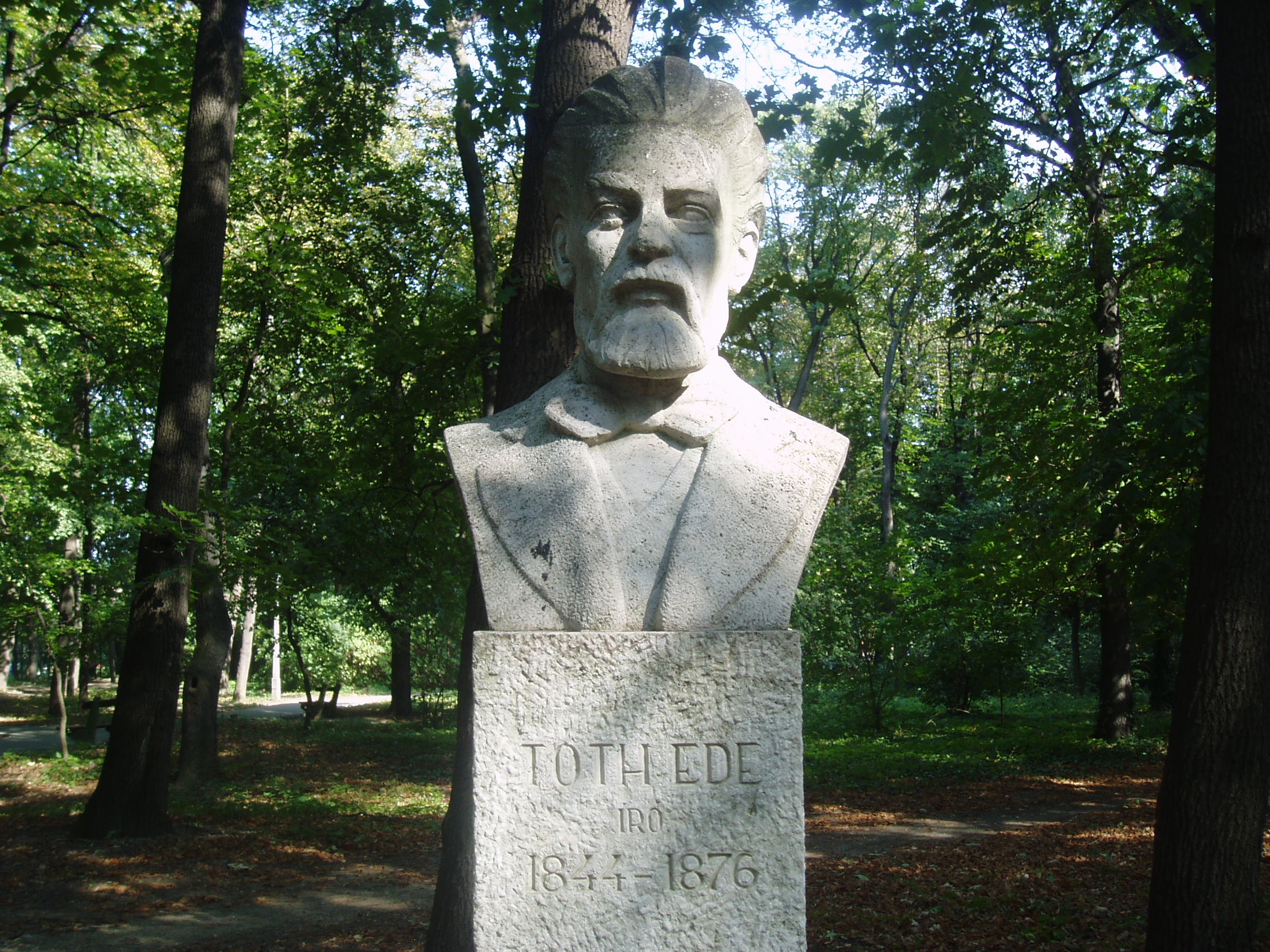 Nyilvános 1127 | 2131 | Sárospatak, Iskolakert: Tóth Ede szobra | A Református Kollégium (lásd: Sárospatak, Rákóczi u. 1.) bejáratával szemben találjuk az Iskolakertnek nevezett parkot. Az 1980-as években természetvédelmi területté nyilvánított Iskolakert sajátos nemzeti érték, mely egyedülálló az országban. Sétányai mentén Patakhoz kötődő jeles személyiségek szobrai állnak. Tóth Ede (1844-1876) író kőből faragott mellszobra Ugray György alkotása (1972). Az egykori pataki diák sok nyomorgás után, iskoláit abbahagyva 1864-ben vándorszínésznek állt. Éveken át rendületlenül próbálkozott az írással, de tehetségét addig nem fedezték fel, míg 1874-ben meg nem írta "A falu rossza" című színművét, mellyel elnyerte a 100 arany értékű Nemzeti Színház 100 arany értékű pályadíját, s egy csapásra híressé vált. A sok nélkülözés azonban annyira megrongálta egészségét, hogy tüdőbaján már nem lehetett segíteni. Rövid munkásságával is új lendületet tudott adni a népszínműnek. A fénykép 2007 augusztusában készült. Felh. irod.: Látnivalók Borsod-Abaúj-Zemplén megyében. Miskolc, Well-PRess, 1995 www.sarospatak.hu/nevezetessegek Magyar életrajzi lexikon |