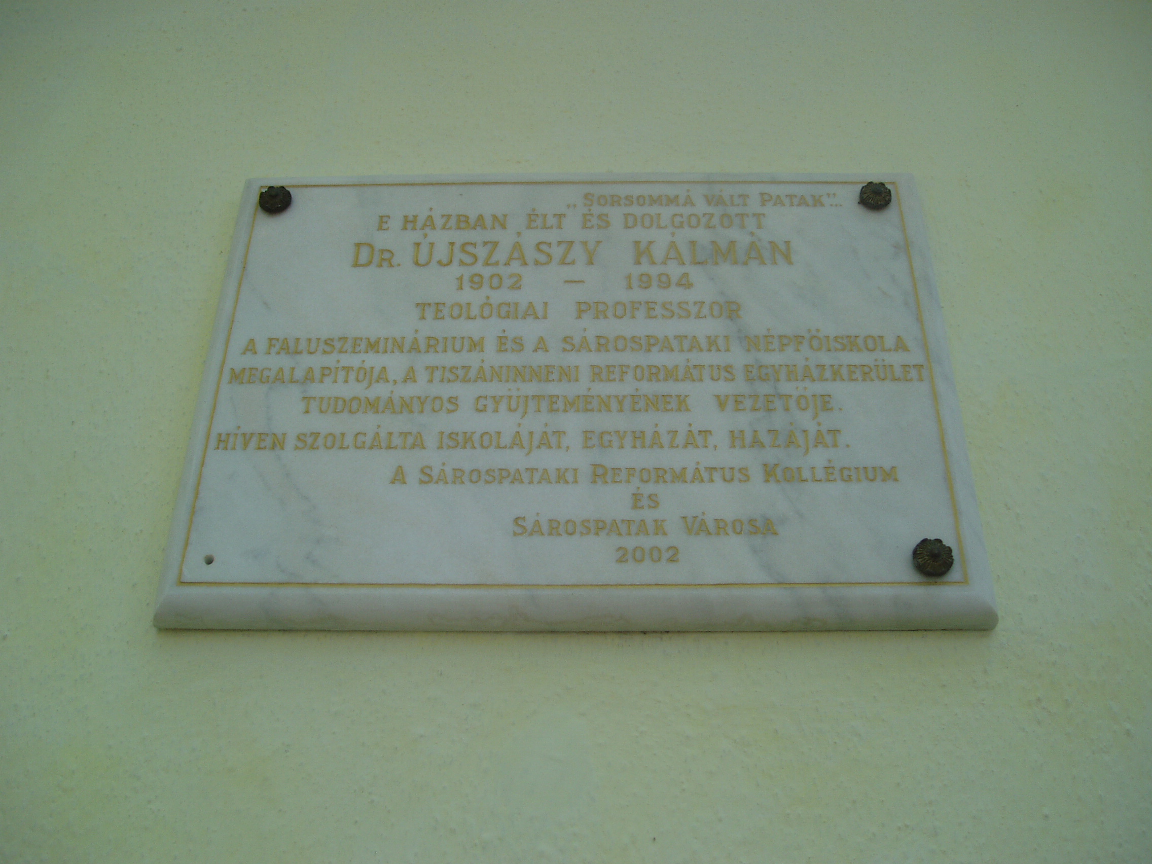 Nyilvános 1049 | 1607 | Sárospatak, Kazinczy utca 11. | 1817 és 1834 között ebben az épületben működött a Református Kollégium nyomdája. A ház később sok jeles közéleti, és főként az irodalom és művészet terén működő személyiség kiröpítő fészke lett. A hagyomány szerint többször megszállt benne Kossuth Lajos. A későbbi évtizedekben az Újszászy család tulajdonába került. Itt élt Dr. Újszászy Kálmán (1902-1994) teológiai professzor, akinek révén a kis ház Patak egyik szellemi központjává vált. Újszászy Kálmán Budapesten született 1902. december 13-án; a gimnáziumot is a fővárosban végezte el. 1921-től a sárospataki teológiára járt, 1931-ben ott lett teológiai akadémiai tanár, ezt megelőzően egy-egy évig Glasgow, Basel, Athén protestáns tanintézeteinek hallgatója volt. A pataki teológián a filozófiai-pedagógiai tanszéket vezette, 1932-ben filozófiai doktorátust szerzett Debrecenben, 1939-ben Szegeden egyetemi magántanári képesítést nyert A falunevelés szellemi alapjai című értekezésével. 1931-től a Sárospatakon kibontakozó faluszeminárium, 1936-től a népfőiskola egyik irányítója, 1944-1946 között a főiskola rektora volt. A népfőiskola 1948-ban - kényszerűen - megszűnt, a református intézmények közül a tanítóképzőt 1950-ben, a gimnáziumot 1952-ben államosították. 1951-ben megszüntették a teológiát is, amely 1992-ben kezdte meg újra a működést. Újszászy professzor 1948 után a kollégium főkönyvtárosa, 1951-től a Tiszáninneni Református Egyházkerület Tudományos Gyűjteményeinek szervezője, 1952-től a Magyarországi Református Egyház zempléni egyházmegyéjének gondnoka, 1964-től 1990-ig pedig a Tiszáninneni Egyházkerület főgondnoka volt. Emellett 1969-től ügyvezető elnöke, 1971-ben pedig elnöke az Országos Református Gyűjteményi Tanácsnak. A fénykép 2007 augusztusában készült. Felh. irod.: Balassa Iván: Sárospatak történeti helyrajza, XVI-XX. század. Miskolc, Borsod-Abaúj-Zemplén Megyei Levéltár, 1994 Takács Béla: A sárospataki nyomda története. Bp. Magyar Helikon, 1978 Benda Kálmán beszélgetése a 90 esztendős Újszászy Kálmánnal. = Confessio 1993. 3. |