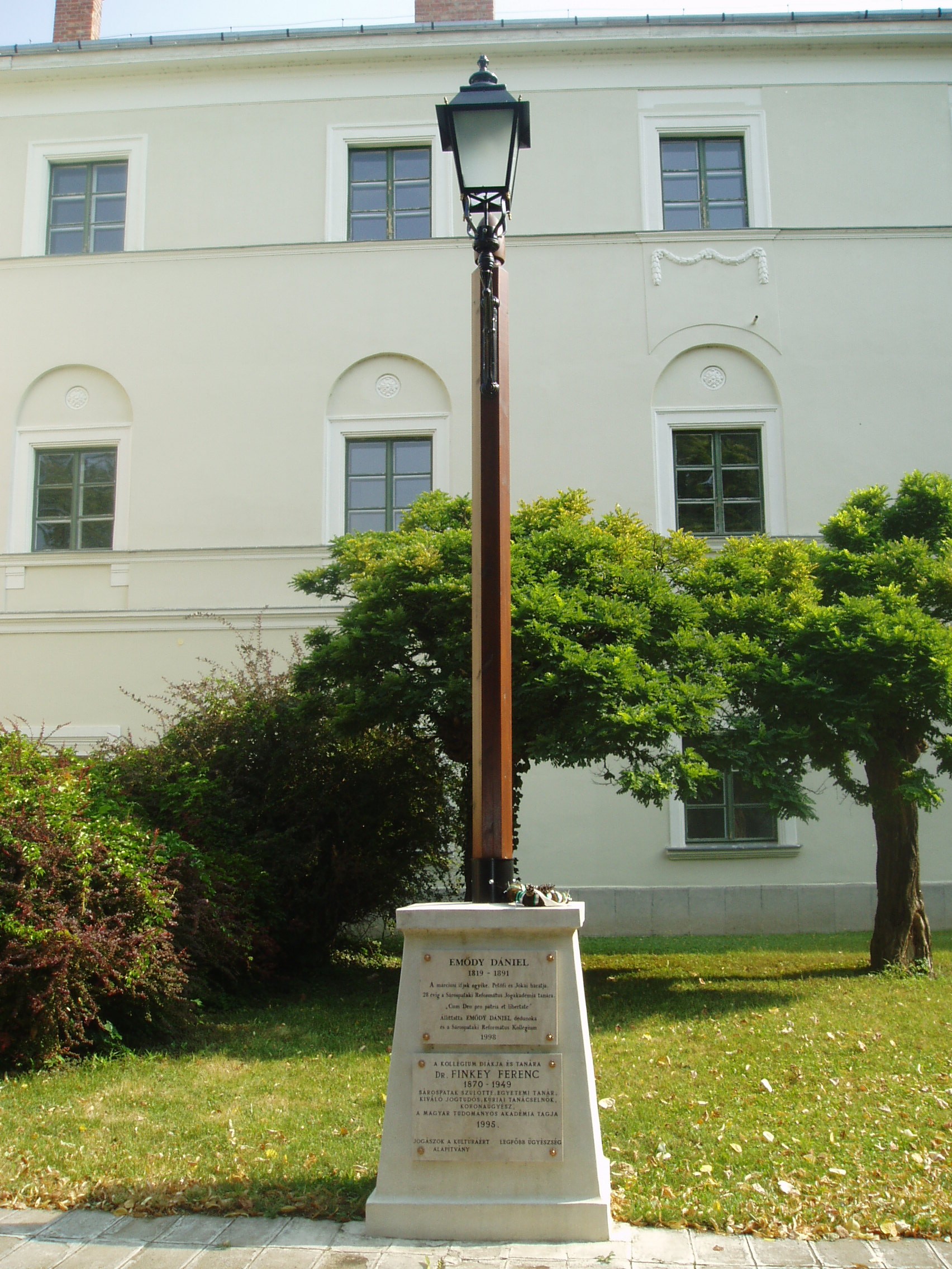 Nyilvános 1056 | 1575 | Sárospatak, Rákóczi utca 1. Református Kollégium | A kollégium főépülete, a Nagy Kollégium a Rákóczi út északi végén található, mely 1804–1814 között korai klasszicista stílusban épült. Szép ráccsal ellátott, háromíves nyílású kapuzaton át jut a látogató az udvarra. Az 1990-es évek közepétől helyeznek el emléktáblákat az itt felállított kandeláberek talapzatán. Az első emléktábla Emődy Dániel (1819-1891) alakját idézi. A márciusi ifjak egyike, Petőfi és Jókai barátja 28 évig volt a Református Jogakadémia tanára. A második táblát Dr. Finkey Ferenc (1870-1949) kiváló jogtudós, koronaügyész, egykori pataki diák emlékére állították. A fénykép 2007 augusztusában készült. Felh. irod.: Détsy Mihály: Sárospatak. Bp. Corvina, 1974 Látnivalók Borsod-Abaúj-Zemplén megyében. Miskolc, Well-PRess, 1995 www.sarospatak.hu/nevezetessegek |