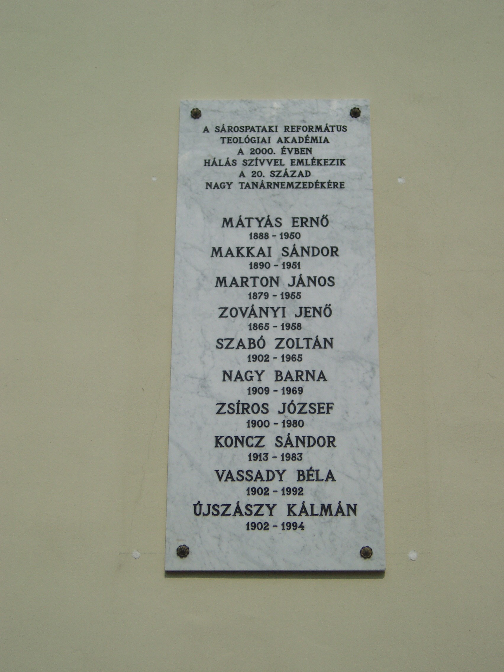 Nyilvános 1077 | 1560 | Sárospatak, Rákóczi utca 1. Református Kollégium | A Kollégium főépületének szárnyai által határolt tágas udvarban áll a régi iskolaépületek utolsó maradványa, az ún. Berna-sor. Északi falán 2000-ben helyezték el a pataki Református Jogakadémia nagy XX. századi tanárnemzedékének emléktábláját. A fénykép 2007 augusztusában készült. |