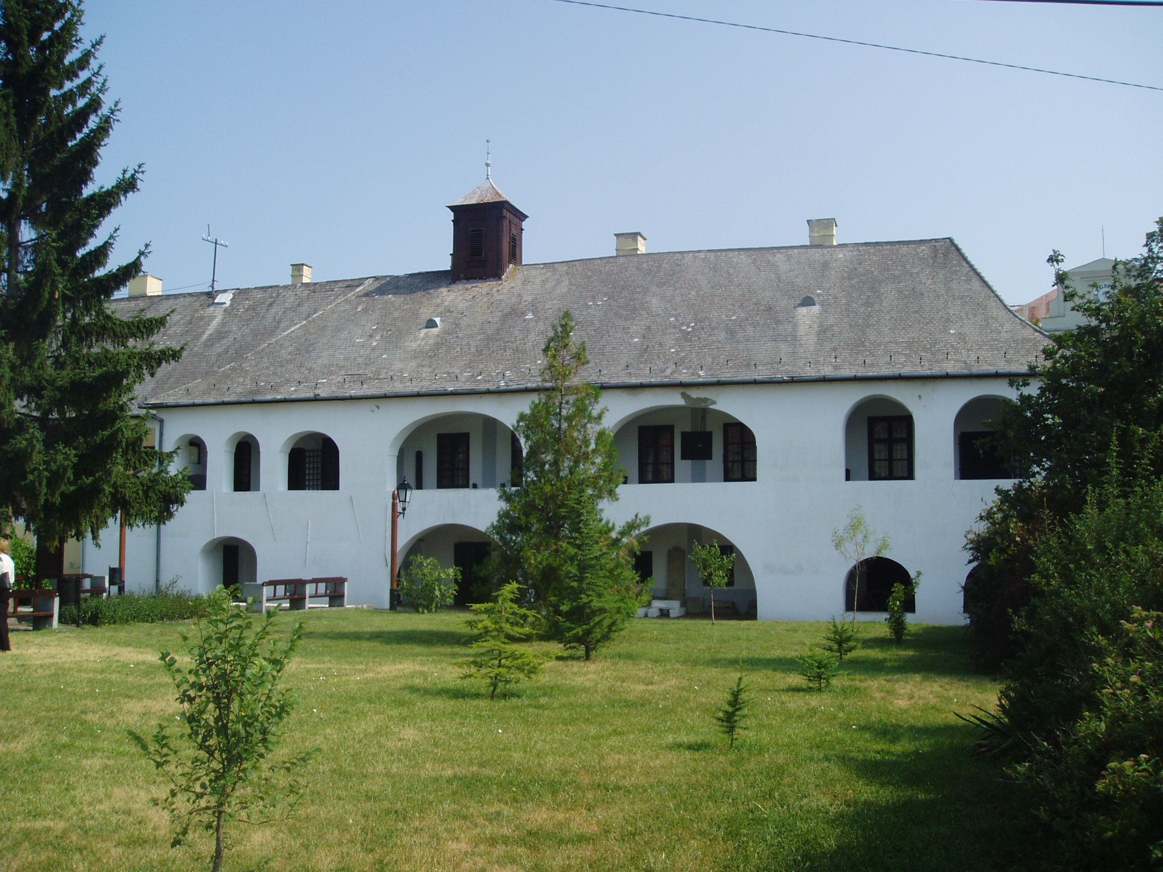 Nyilvános 1039 | 1568 | Sárospatak, Rákóczi utca 1. Református Kollégium | A Kollégium főépületének szárnyai által határolt tágas udvarban áll a régi iskolaépületek utolsó maradványa, az ún. Berna-sor. 1771/72-ben a fizika oktatása számára és a fizikaprofesszor lakásául épült. Az egyemeletes, hosszú szárny déli oldalát később kétszintes, árkádos tornáccal bővítették, feljáróval a nyugati oldalon. Az épület a korabeli provinciális magyar építészet szép példája. Az emelet boltozott termeiben a kollégium történetét bemutató kiállítás látható. A fénykép 2007 augusztusában készült. Felh. irod.: Détsy Mihály: Sárospatak. Bp. Corvina, 1974 |