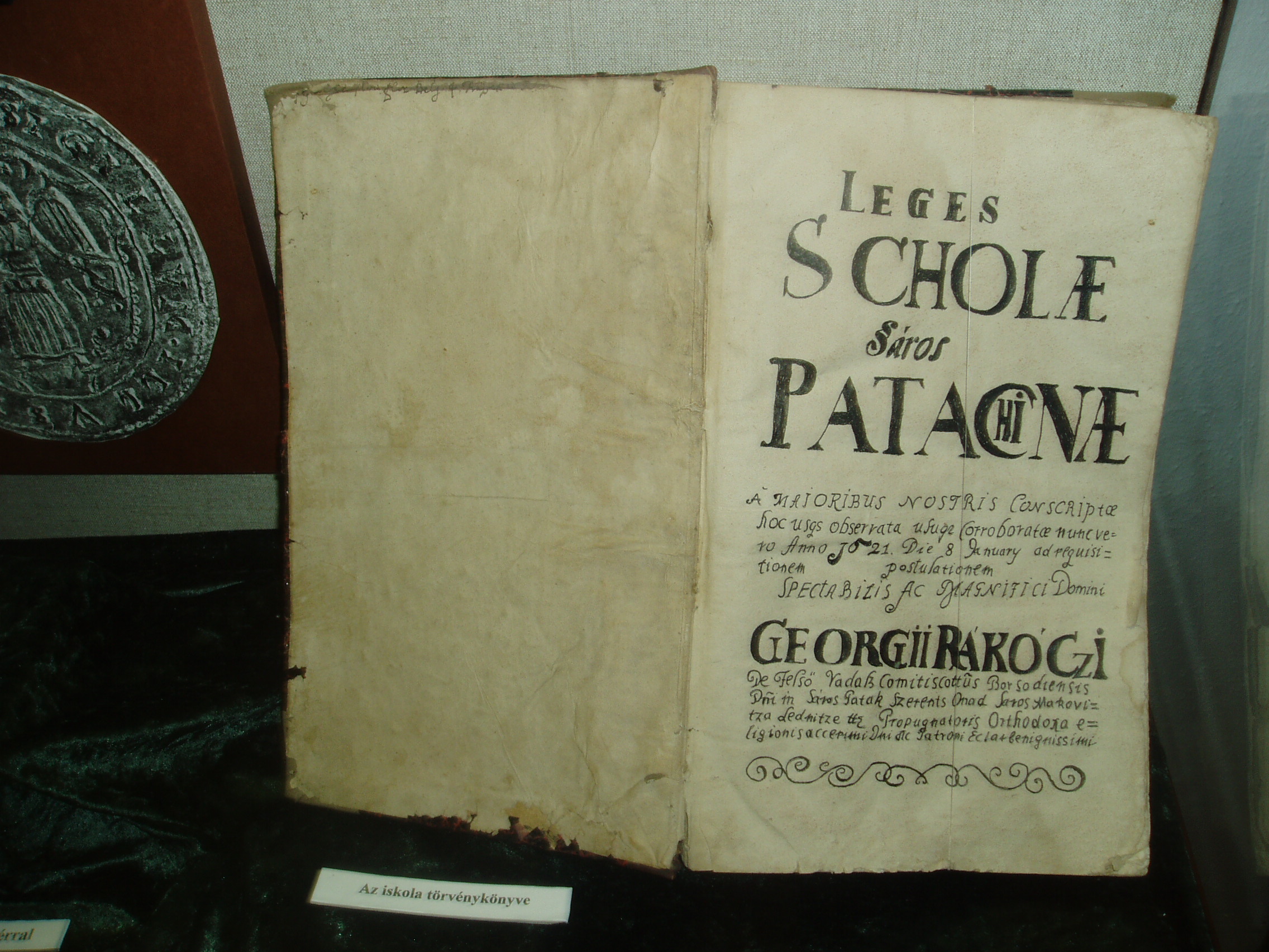 Nyilvános 1046 | 1503 | Sárospatak, Rákóczi utca 1. Református Kollégium | A Kollégium főépületének szárnyai által határolt tágas udvarban áll a régi iskolaépületek utolsó maradványa, az ún. Berna-sor. 1771/72-ben a fizika oktatása számára és a fizikaprofesszor lakásául épült. Az egyemeletes, hosszú szárny déli oldalát később kétszintes, árkádos tornáccal bővítették, feljáróval a nyugati oldalon. Az épület a korabeli provinciális magyar építészet szép példája. Az emelet boltozott termeiben a kollégium történetét bemutató kiállítás látható. A képen a Református Kollégium 1621-ből származó Törvénykönyve látható. A fénykép 2007 augusztusában készült. |
